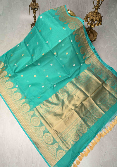 Turquoise Exquisite Banarasi Kora Silk Saree with Gold Silver Zari Buttas and Zari Border | SILK MARK CERTIFIED