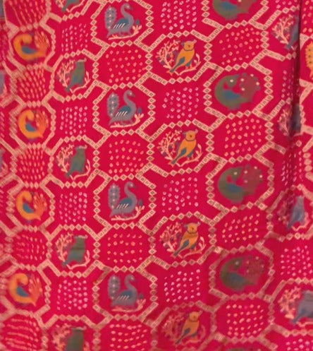 This magnificent saree is a fusion of some of India's richest weaving traditions. The blood red tone, a classic color for weddings and celebrations, is beautifully presented on a luxurious georgette silk fabric. The body features an authentic hand-Bandhej tie-dye pattern, which is intricately woven with a Banarasi Shikargah zari jaal. This rich jaal depicts traditional hunting scenes and nature motifs, adding a captivating narrative. The pallu and border are crafted in the opulent Paithani style, known for its vibrant and intricate weaving, creating a truly grand and unique statement piece.