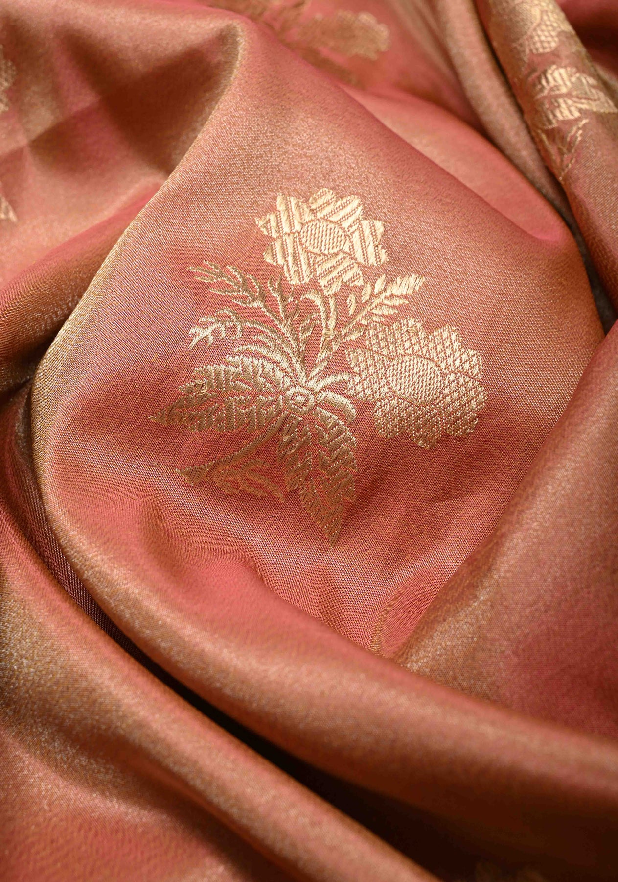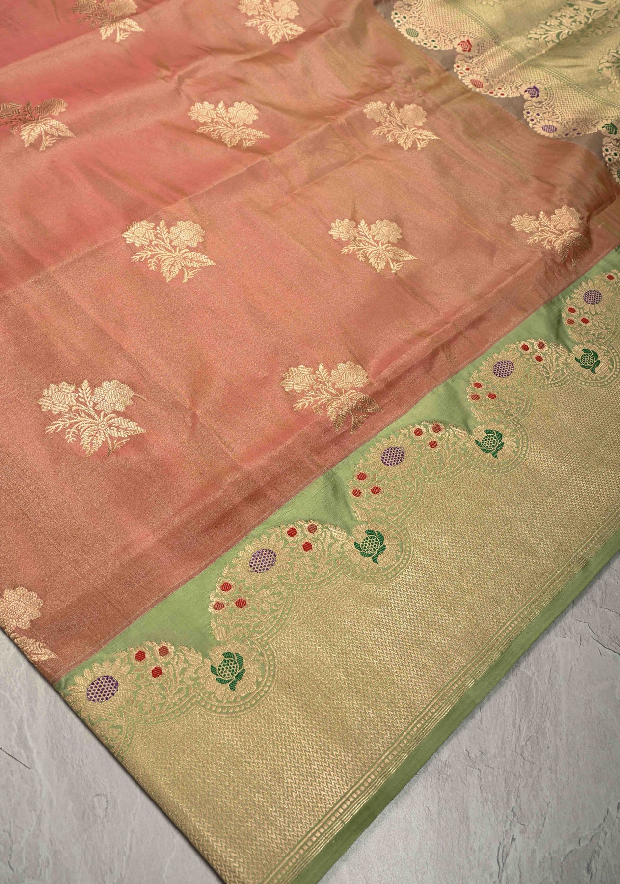 This Dusty Peach Banarasi Katan Tissue Silk Saree is a beautiful expression of refined elegance and traditional artistry. Woven from Katan tissue silk, the saree features a soft dusty peach hue that shimmers with a natural sheen. Intricate floral zari buttas are delicately scattered across the body, adding a touch of classic charm. The contrast Meenakari zari border, enriched with multicolored detailing, brings a vibrant finish to the saree, making it perfect for weddings, festive celebrations, and grand occasions.