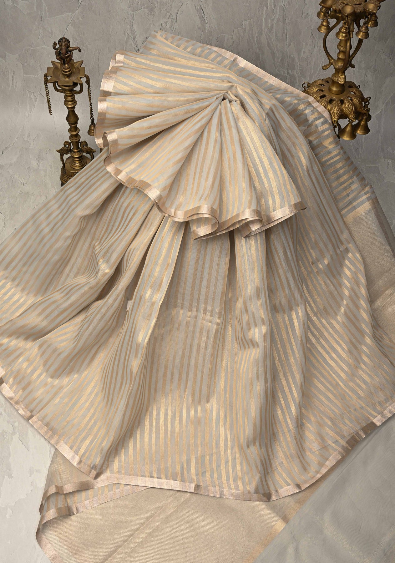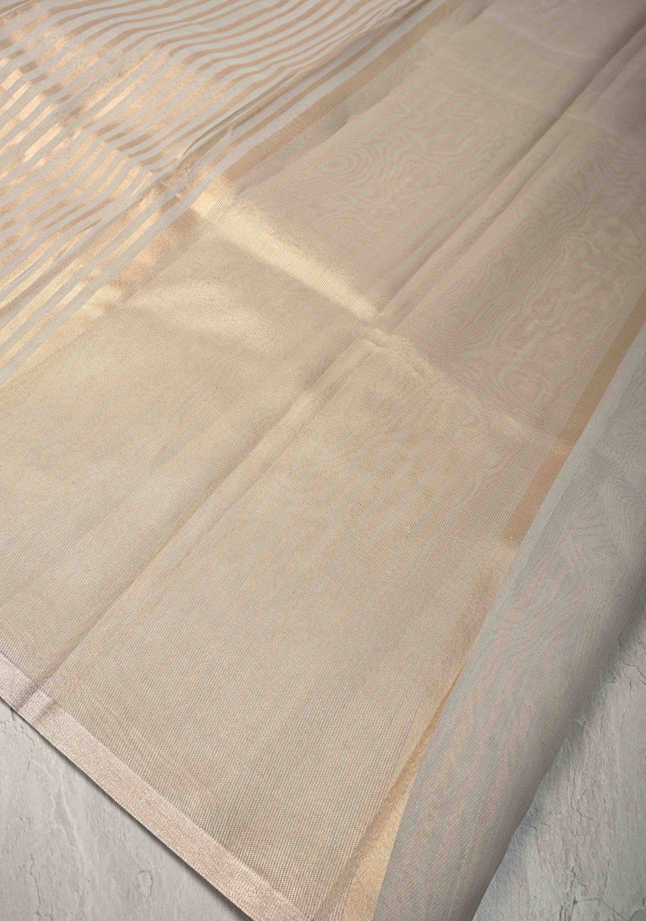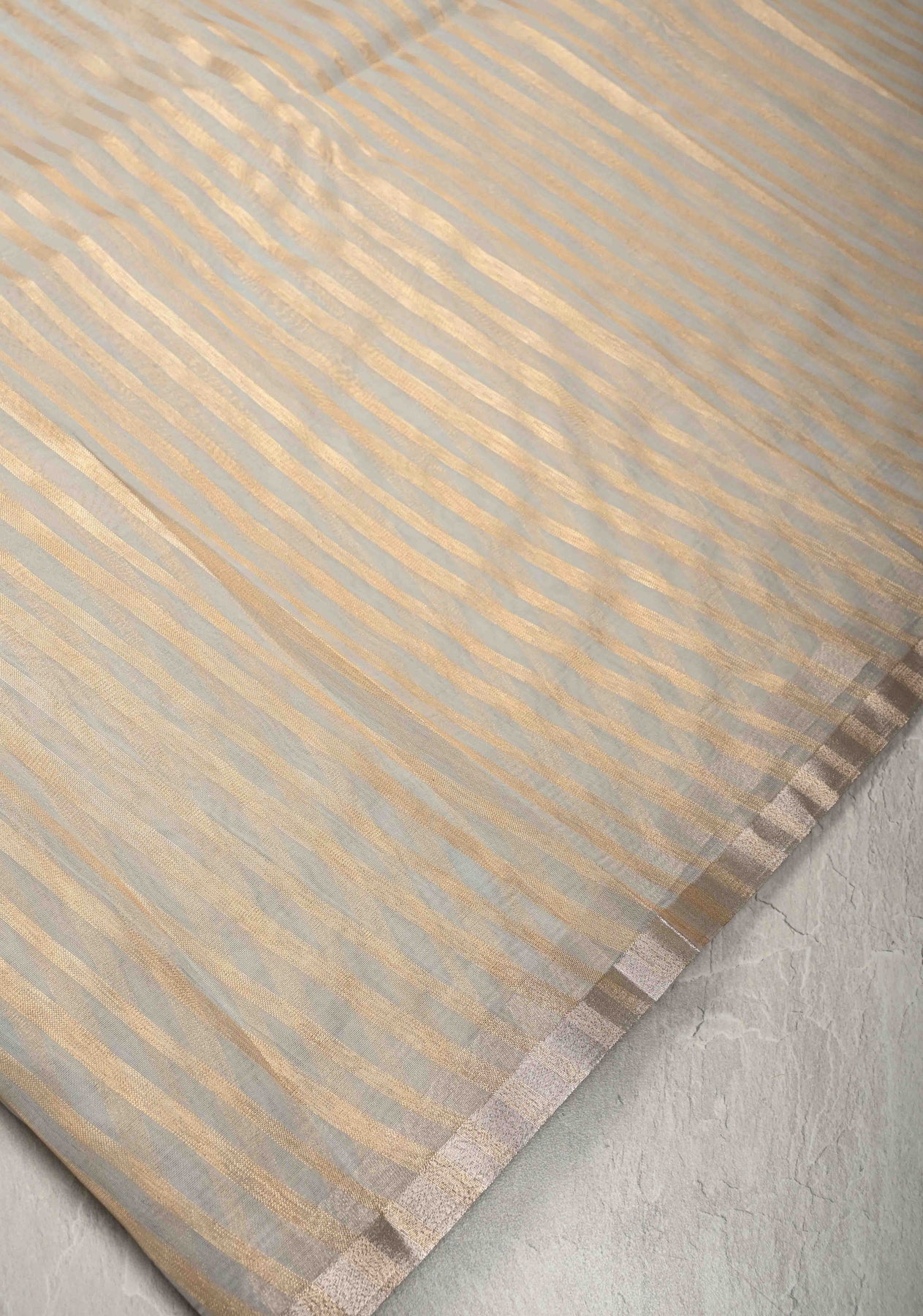 Adorned with subtle tissue stripes, the saree features a delicate metallic sheen that enhances the sophisticated grey base with gentle texture and shimmer. These fine stripes add a refined glow, making the saree ideal for both day and evening occasions.