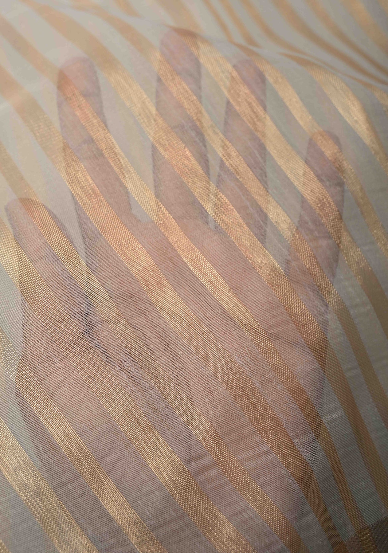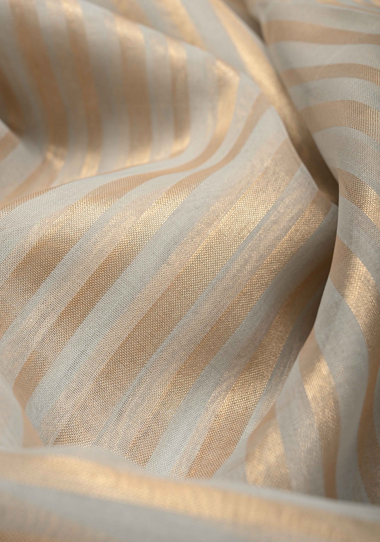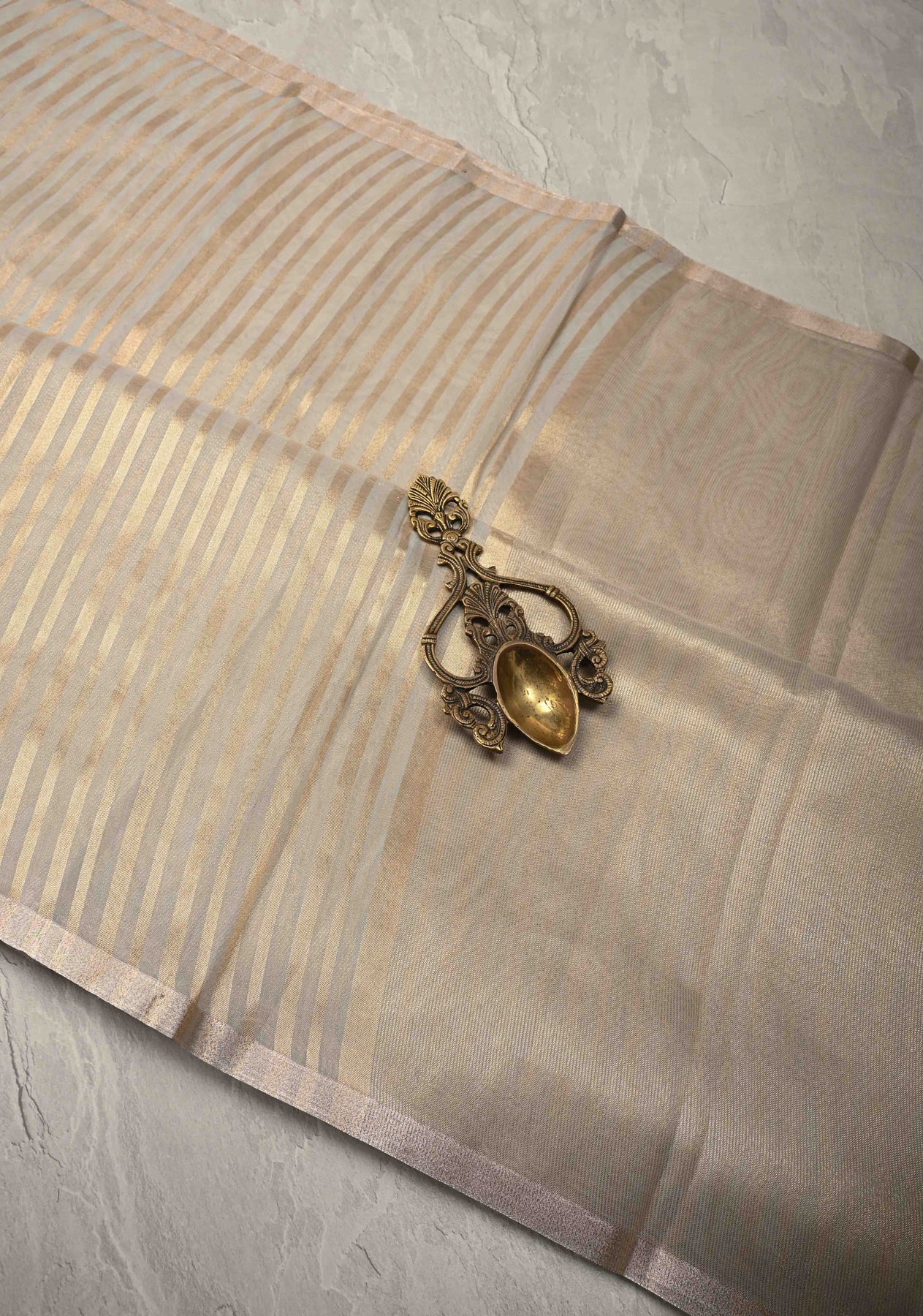 Adorned with subtle tissue stripes, the saree features a delicate metallic sheen that enhances the sophisticated grey base with gentle texture and shimmer. These fine stripes add a refined glow, making the saree ideal for both day and evening occasions.