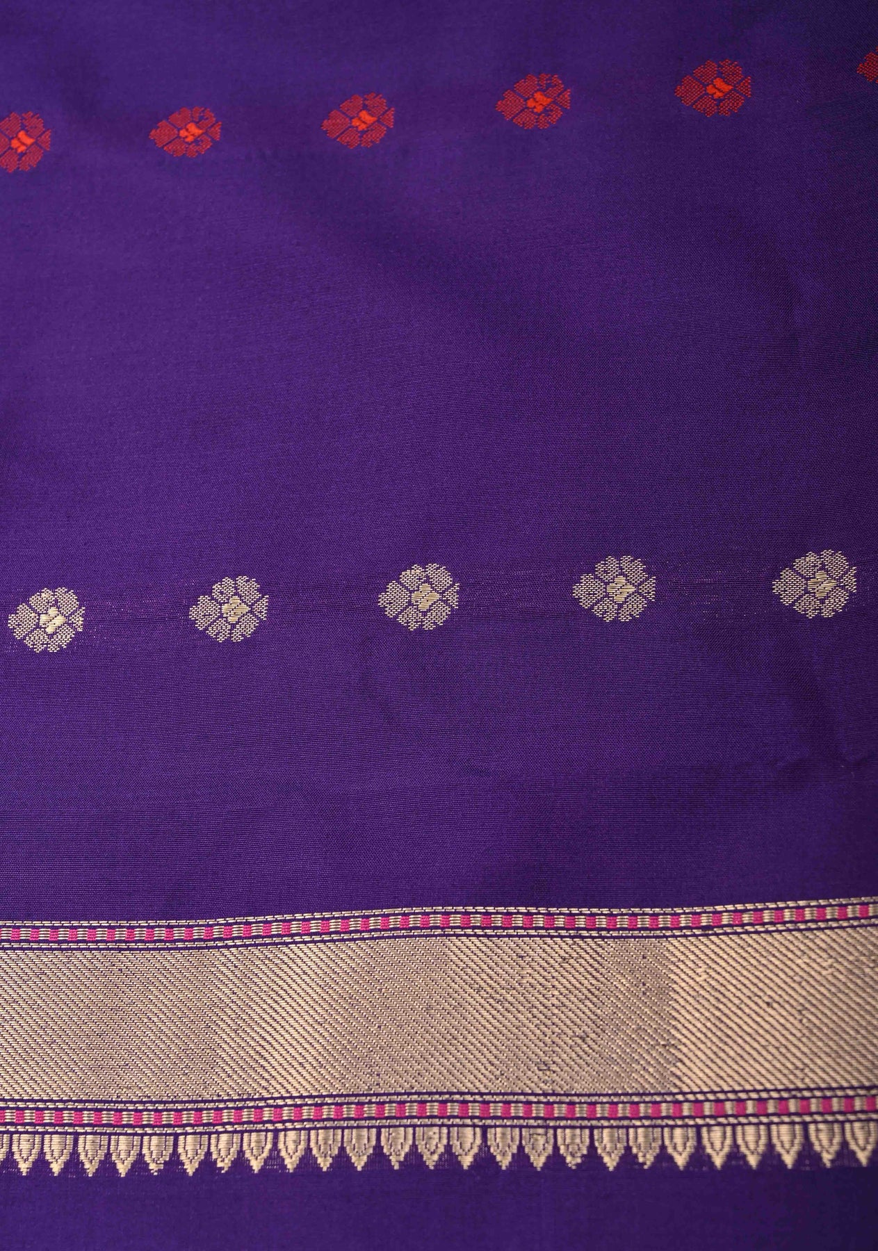 This Ink Purple Banarasi Katan Silk Saree is a masterpiece of timeless elegance and skilled craftsmanship. Woven from Katan silk, the saree features delicate resham vine stripes running gracefully across the deep ink purple body, creating a sophisticated texture. The highlight lies in the ornate zari border adorned with intricate Meenakari buttas, showcasing vibrant craftsmanship with colorful detailing. Luxuriously smooth and lightweight, this saree is a perfect pick for weddings, festive occasions, and grand celebrations, reflecting regal charm with every drape.