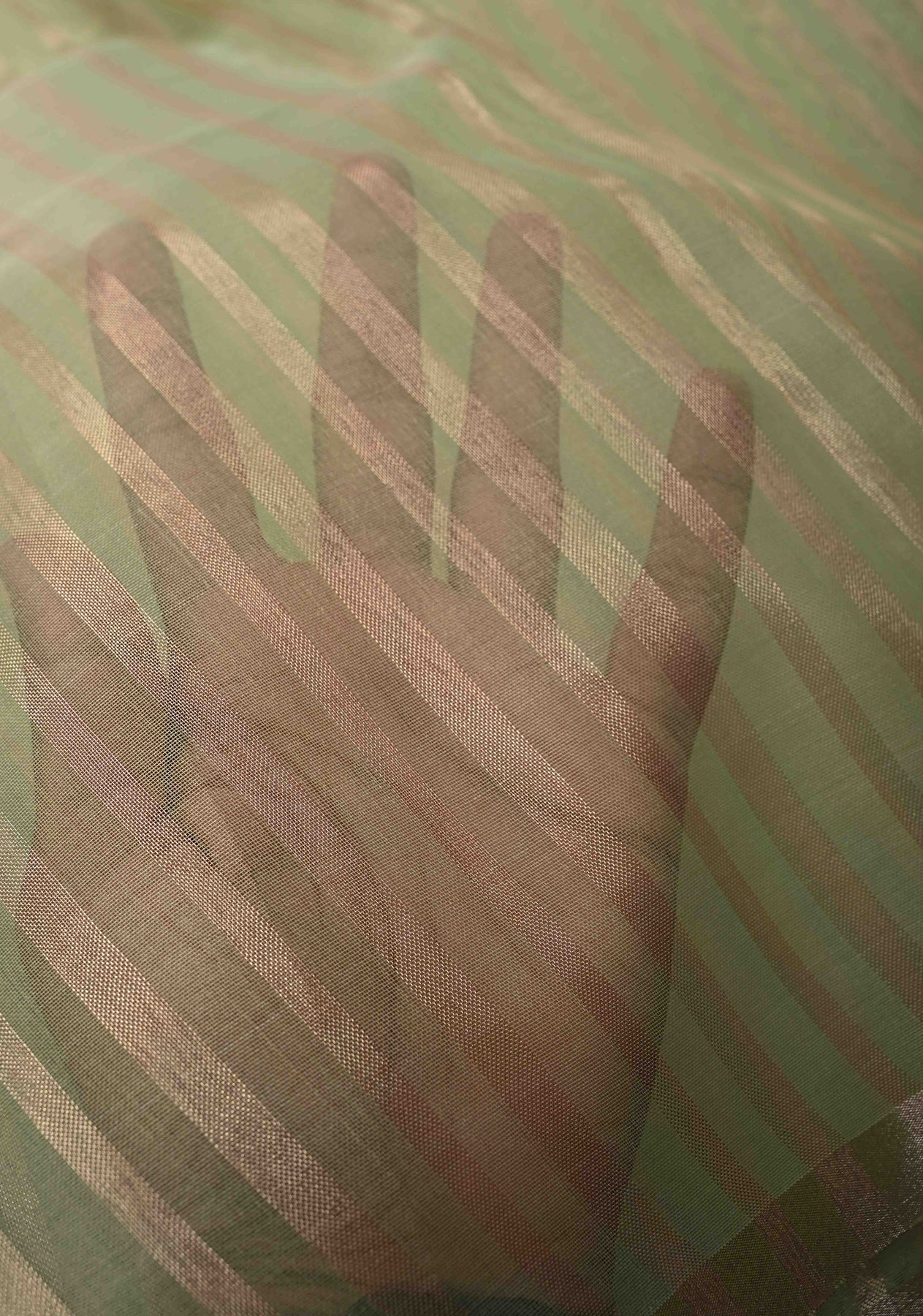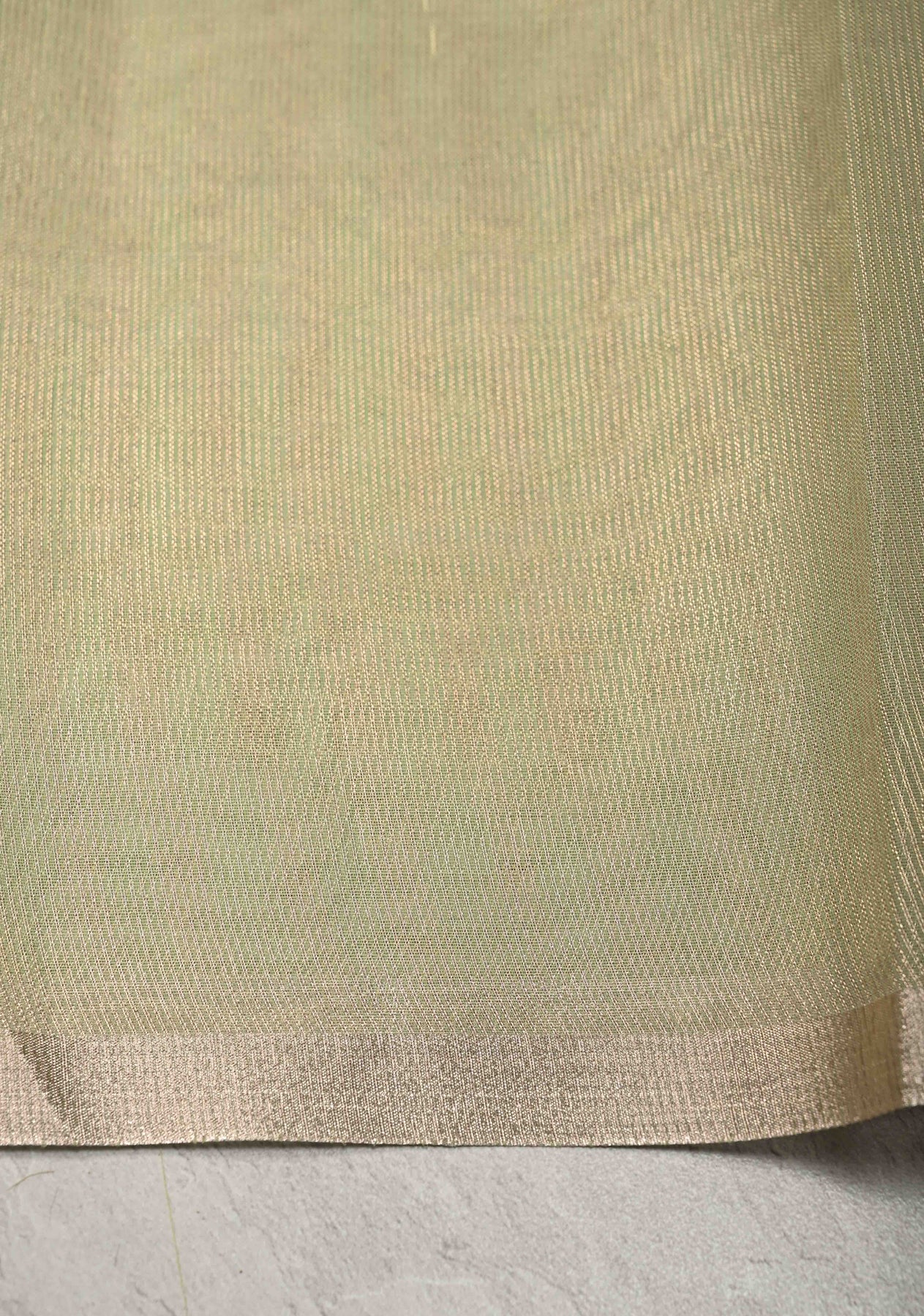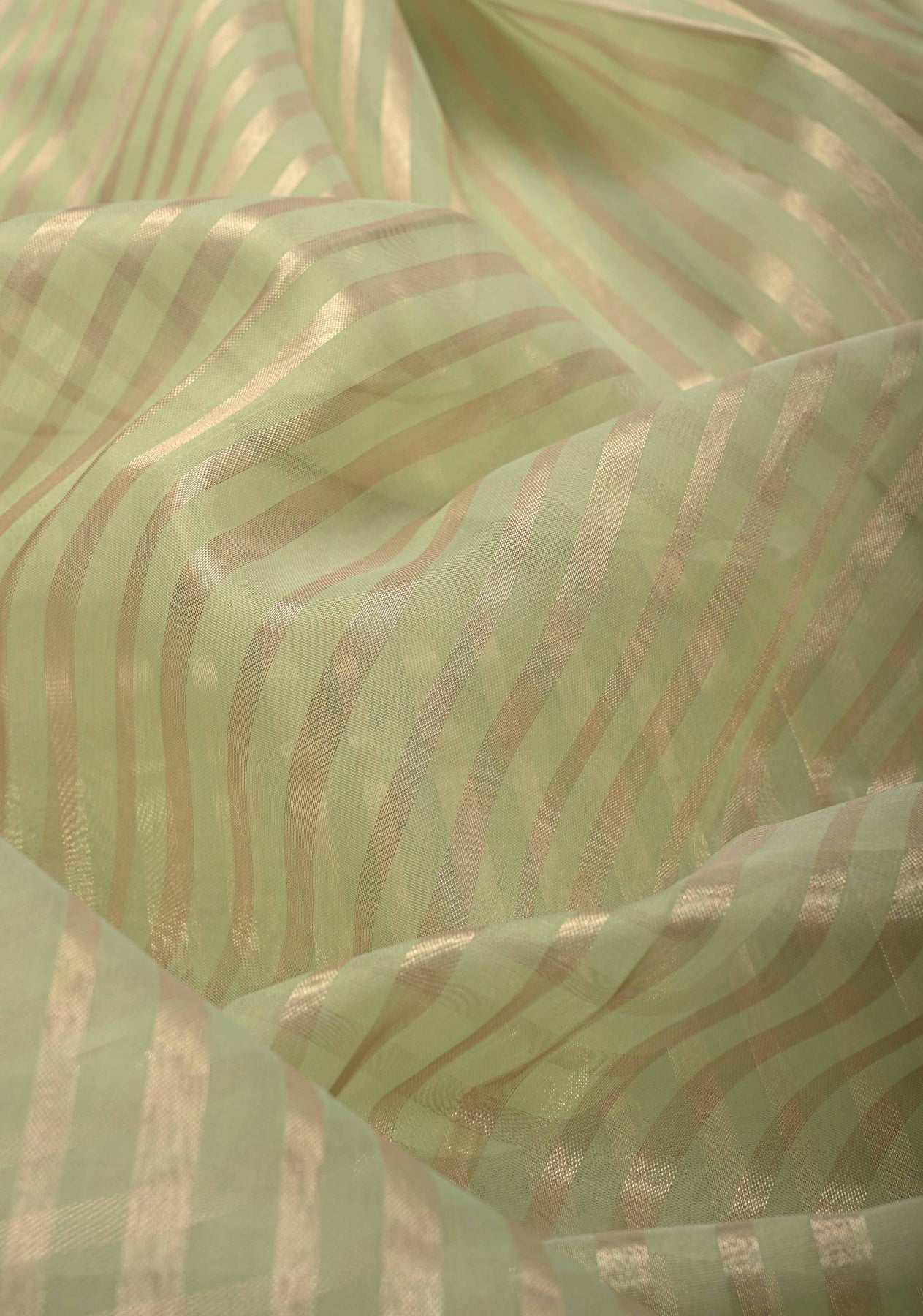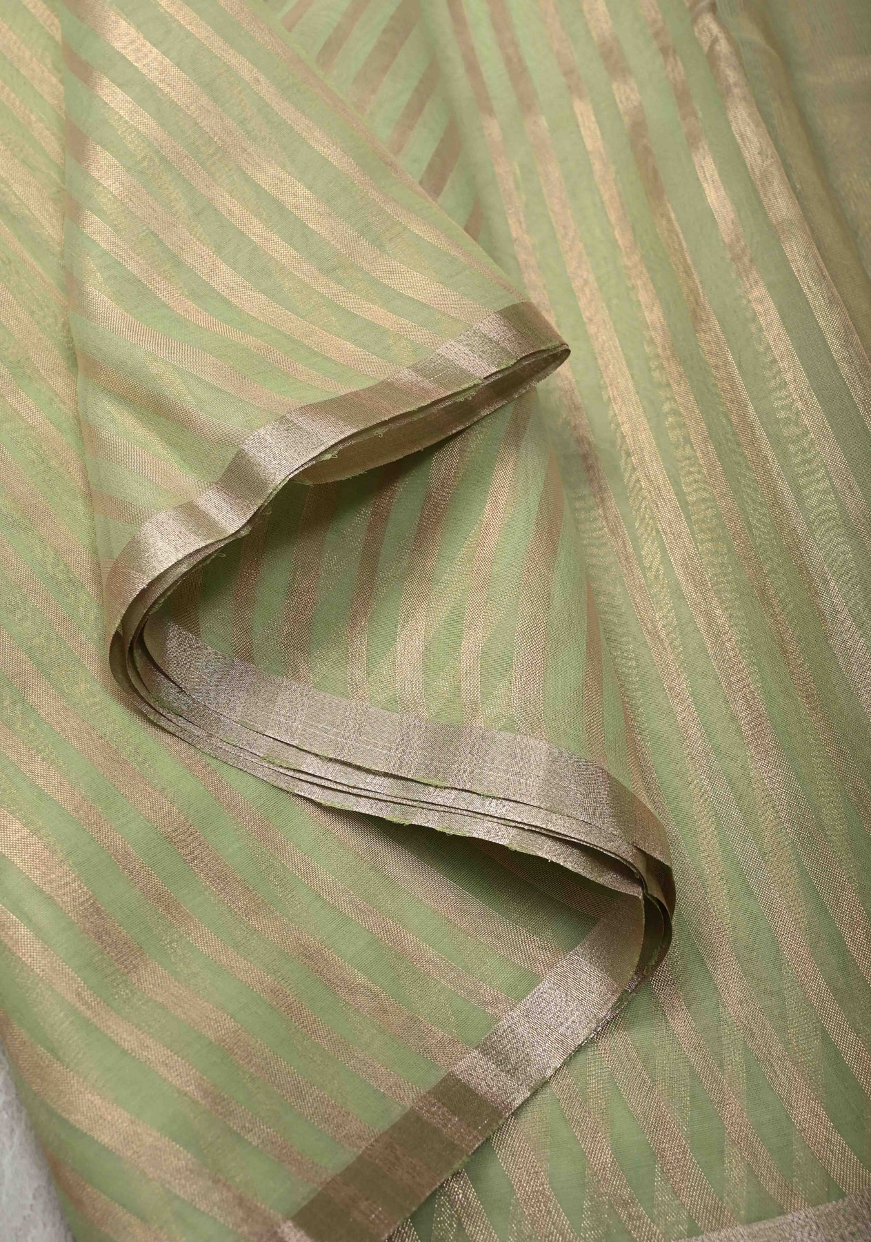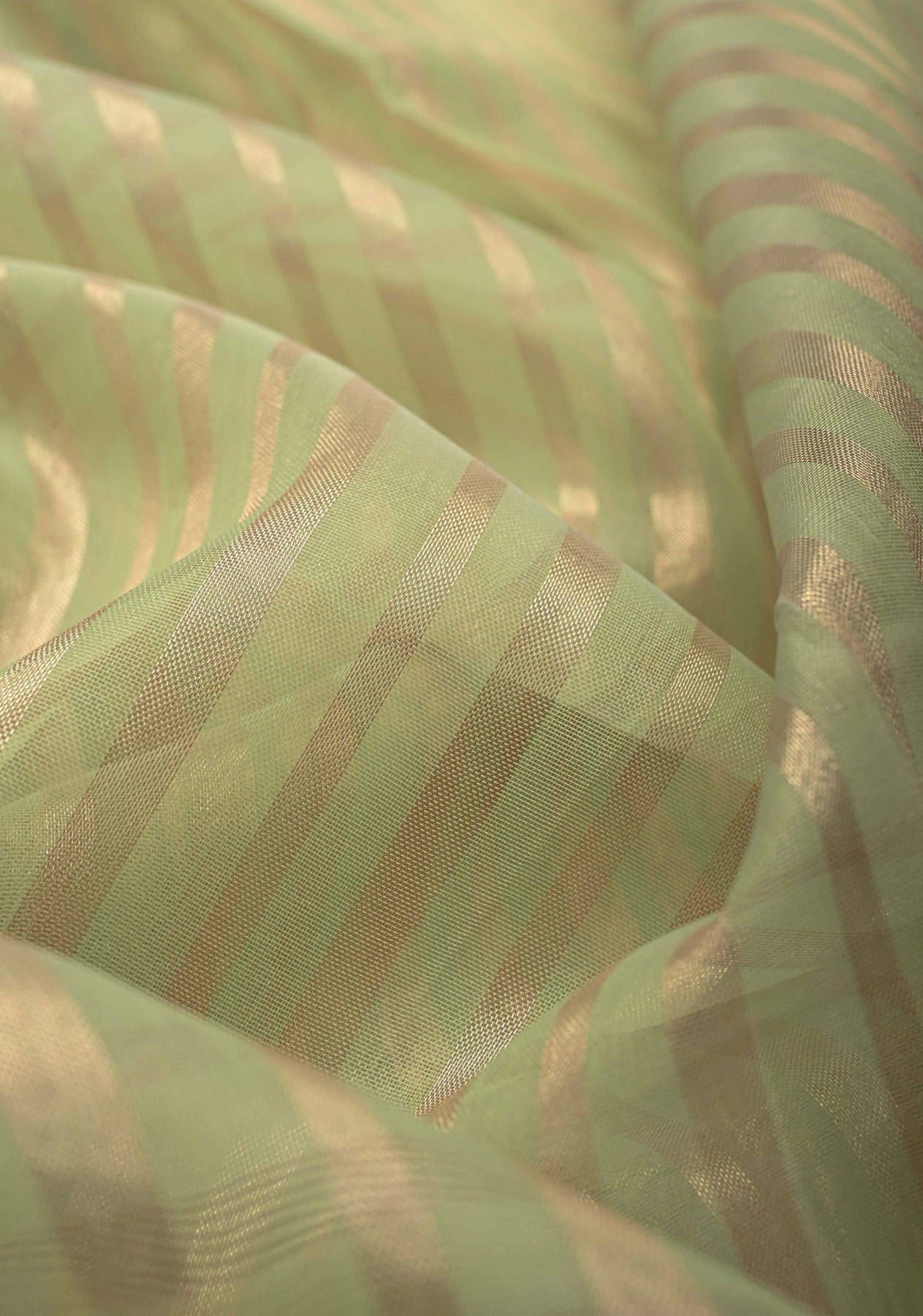 The saree features delicate tissue stripes that add a subtle metallic shimmer to the refreshing lime green base, creating a refined and contemporary texture. These understated stripes catch the light beautifully, adding quiet sophistication without overpowering the look.