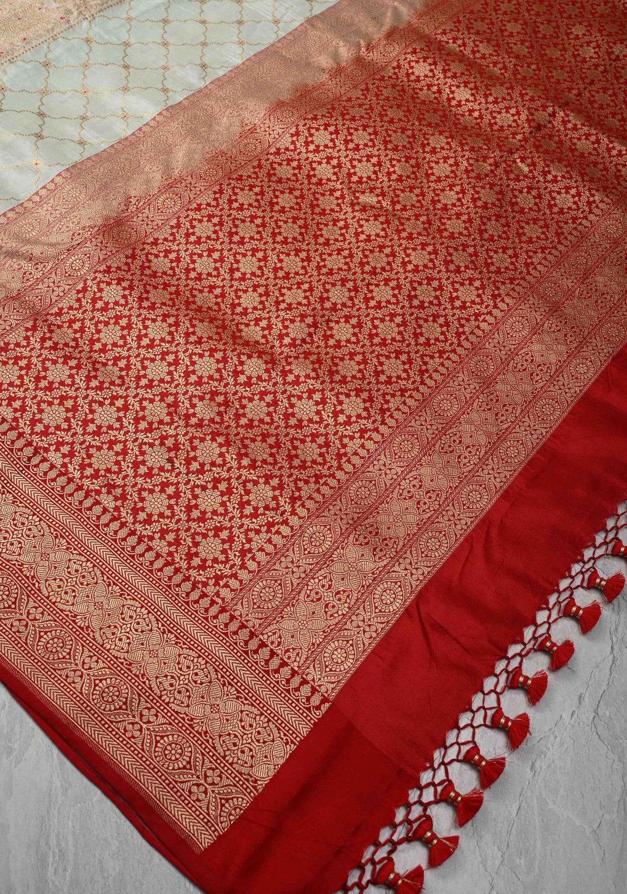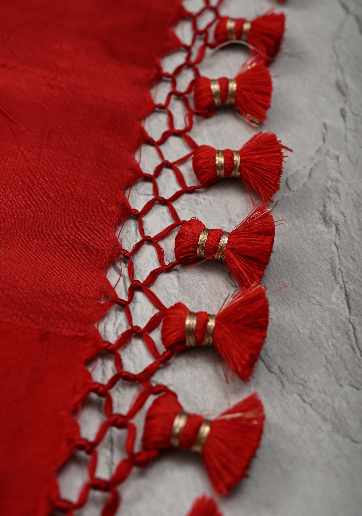 This saree is ready to wear with fall and pico done. Handmade silk tassels adorn the pallu and add more grace to it. An unstitched blouse fabric is included.