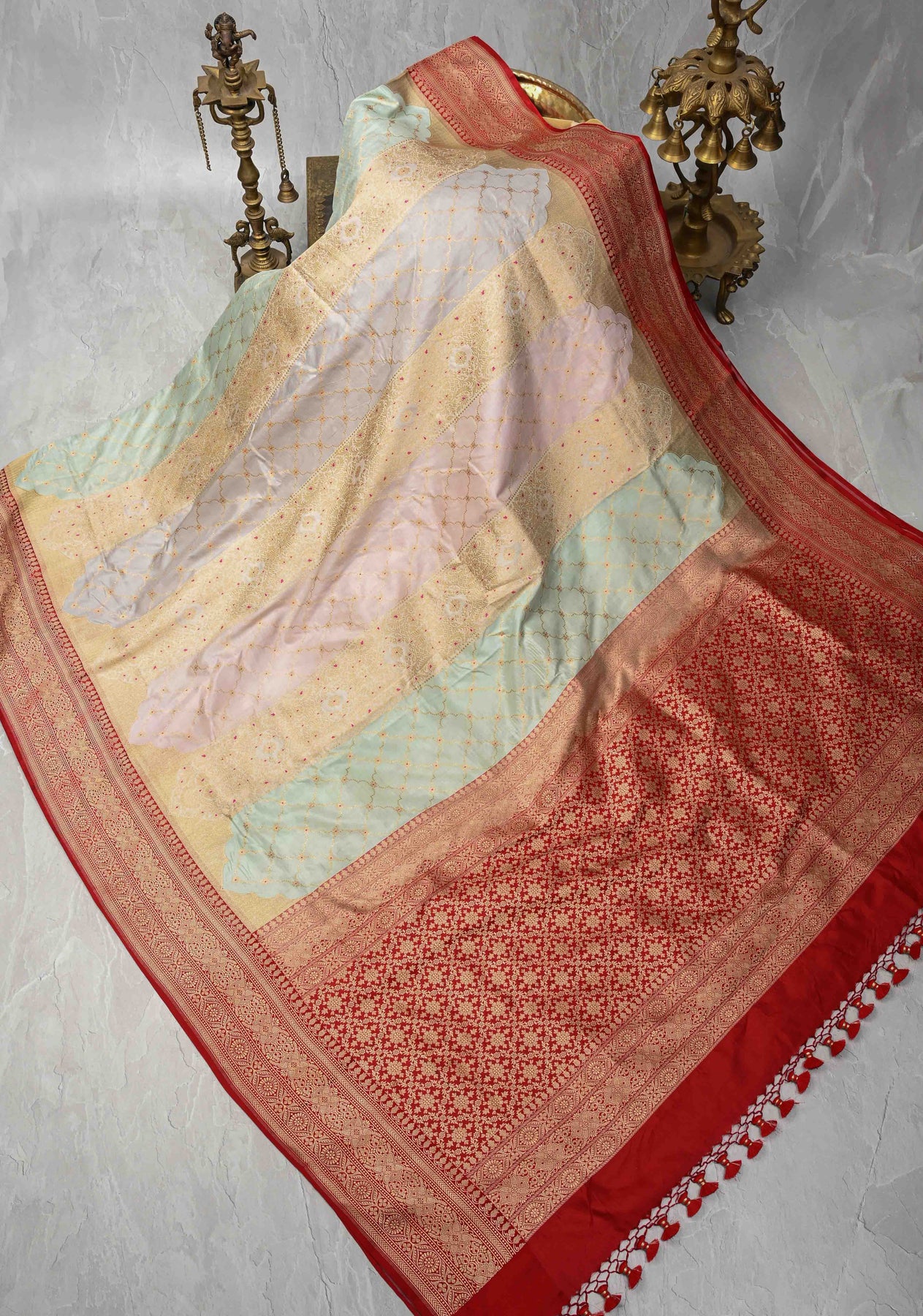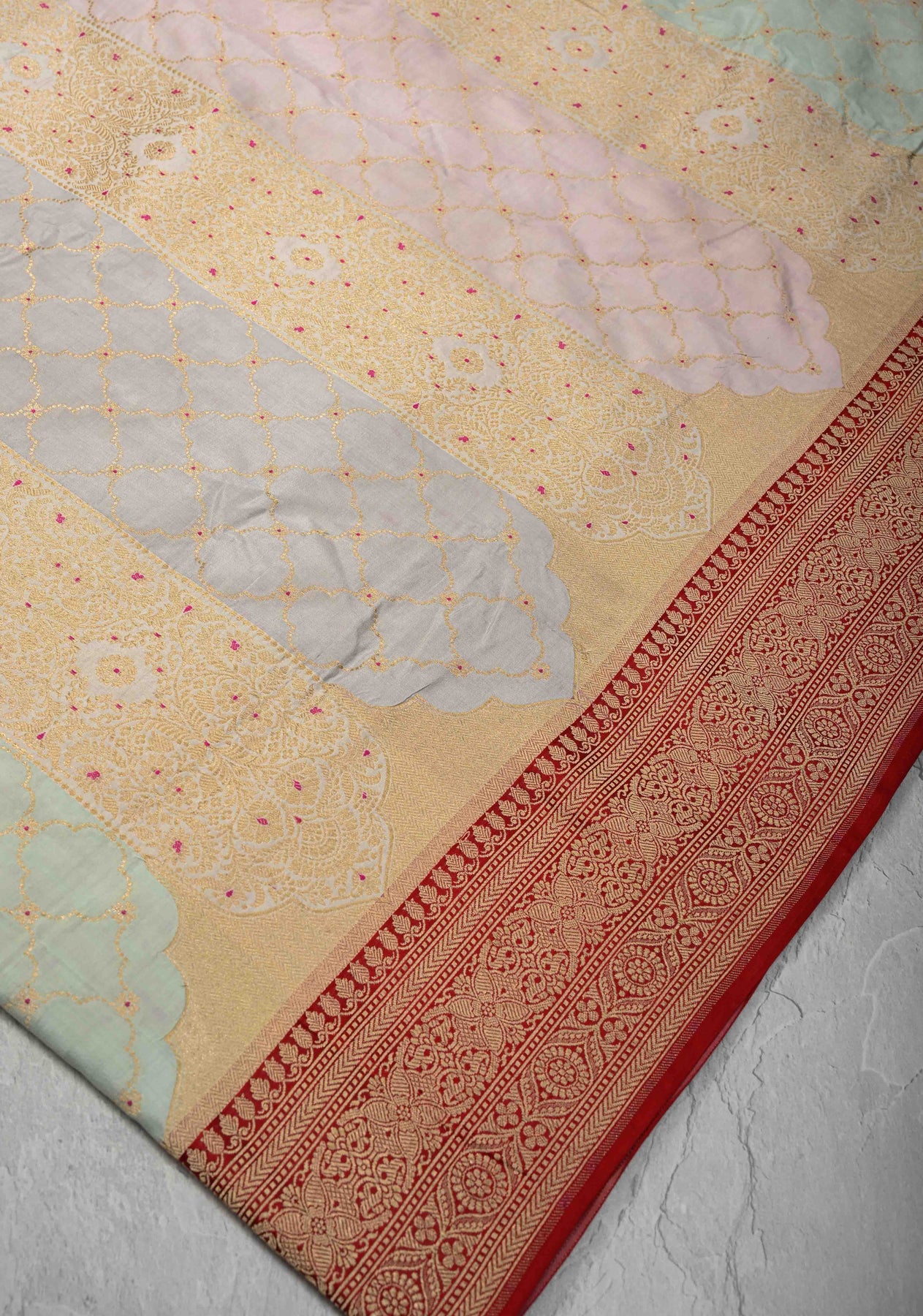 Multicolor Rangkaat Style jharoka Pattern Banarasi Katan Silk Saree with Red Zari Border | SILK MARK CERTIFIED