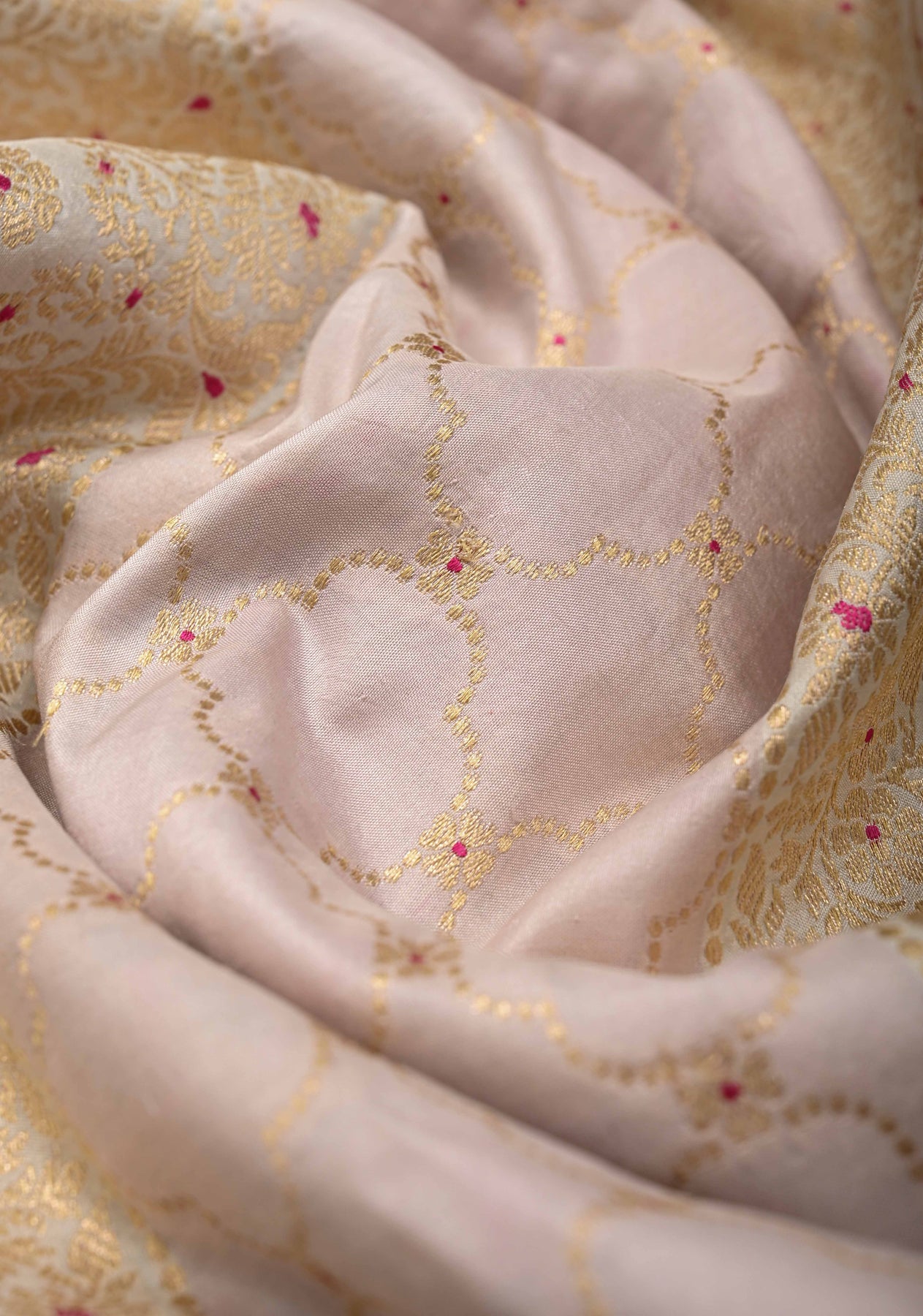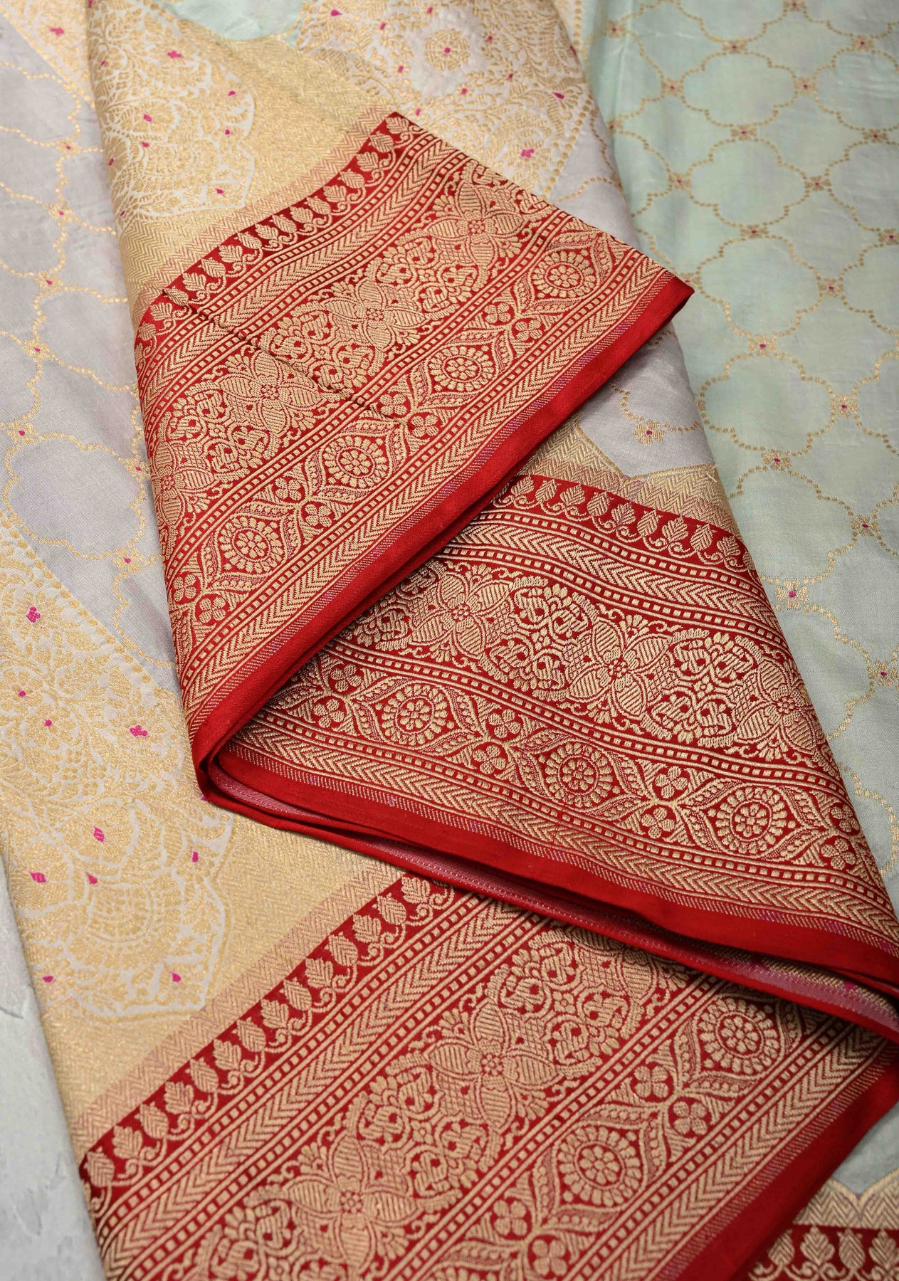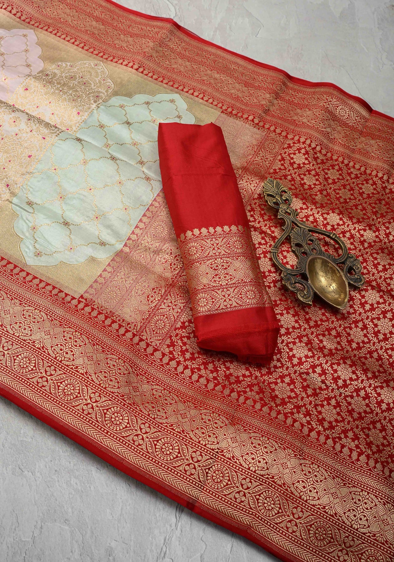 This magnificent saree is a testament to the artistry of Banarasi weaving. The vibrant multicolor hues are beautifully complemented by an intricate Jharoka pattern woven throughout the fabric using the rare Rangkaat technique. A shimmering red zari border adds a final touch of traditional grandeur. This piece is a masterpiece of handloom artistry, blending the luxurious texture of Katan silk with the classic beauty of Banarasi weaving. It’s perfect for weddings and grand celebrations
