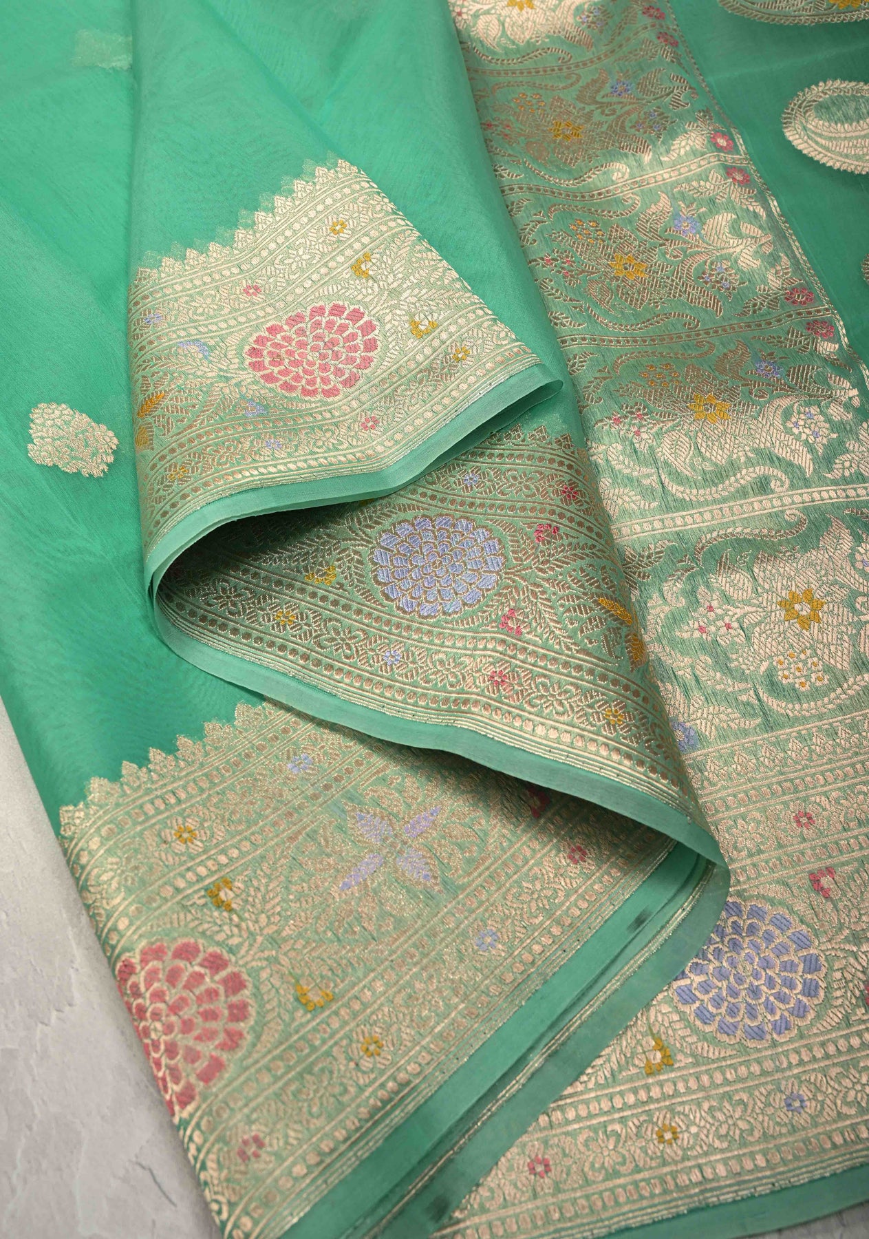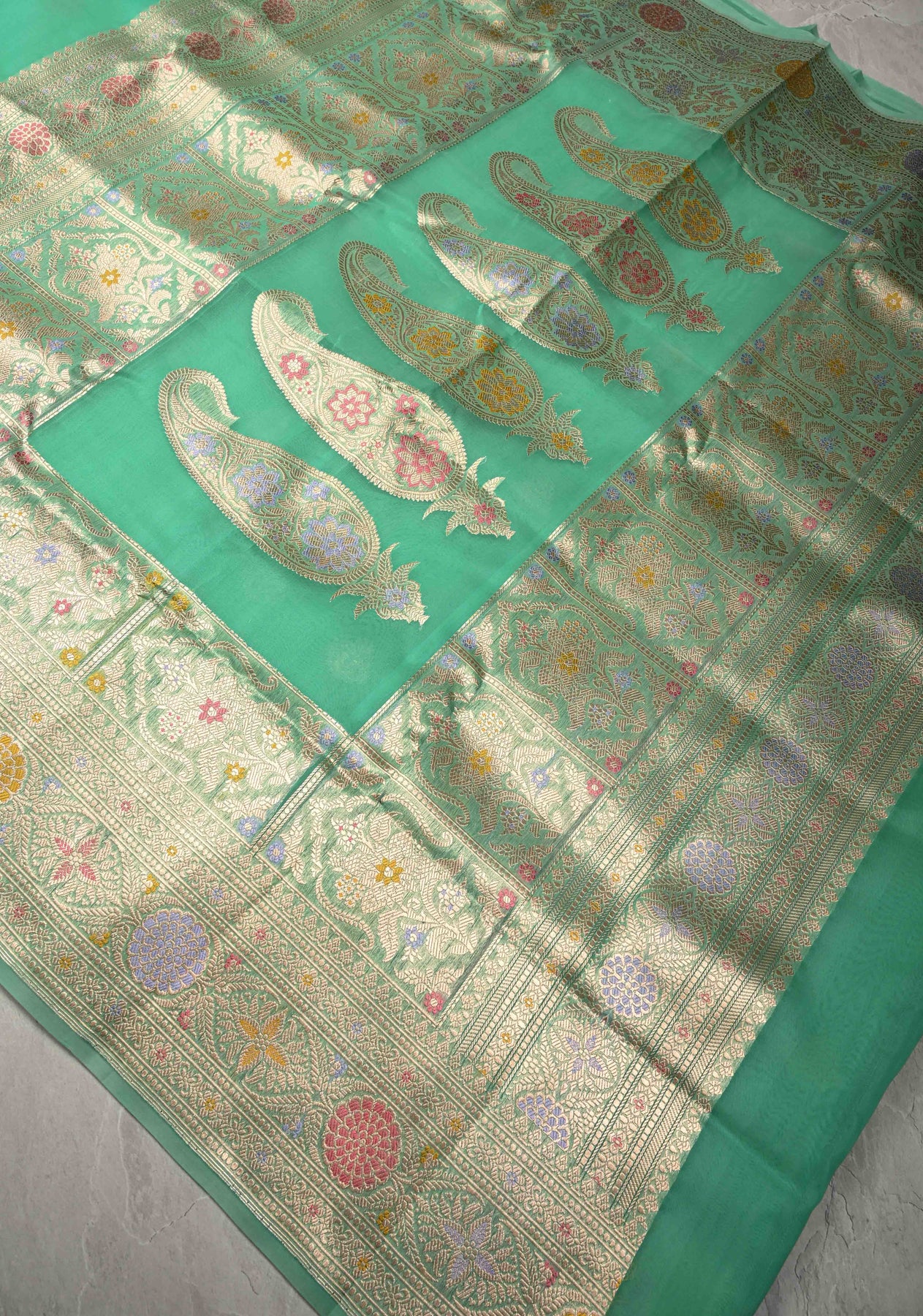 Drape yourself in refined with this Pista Green Banarasi Pure Kora Organza Saree, featuring exquisite Meenakari design work that reflects the intricate artistry of Banaras. Woven on a luminous tissue silk base, the saree showcases an elegant floral brocade pattern that adds depth and richness to its soft pastel hue. The shimmering zari border enhances its regal appeal, making it an ideal choice for weddings, festive occasions, and grand celebrations. With its perfect blend of delicate texture and detailed craftsmanship, this saree is a statement of timeless elegance and heritage.