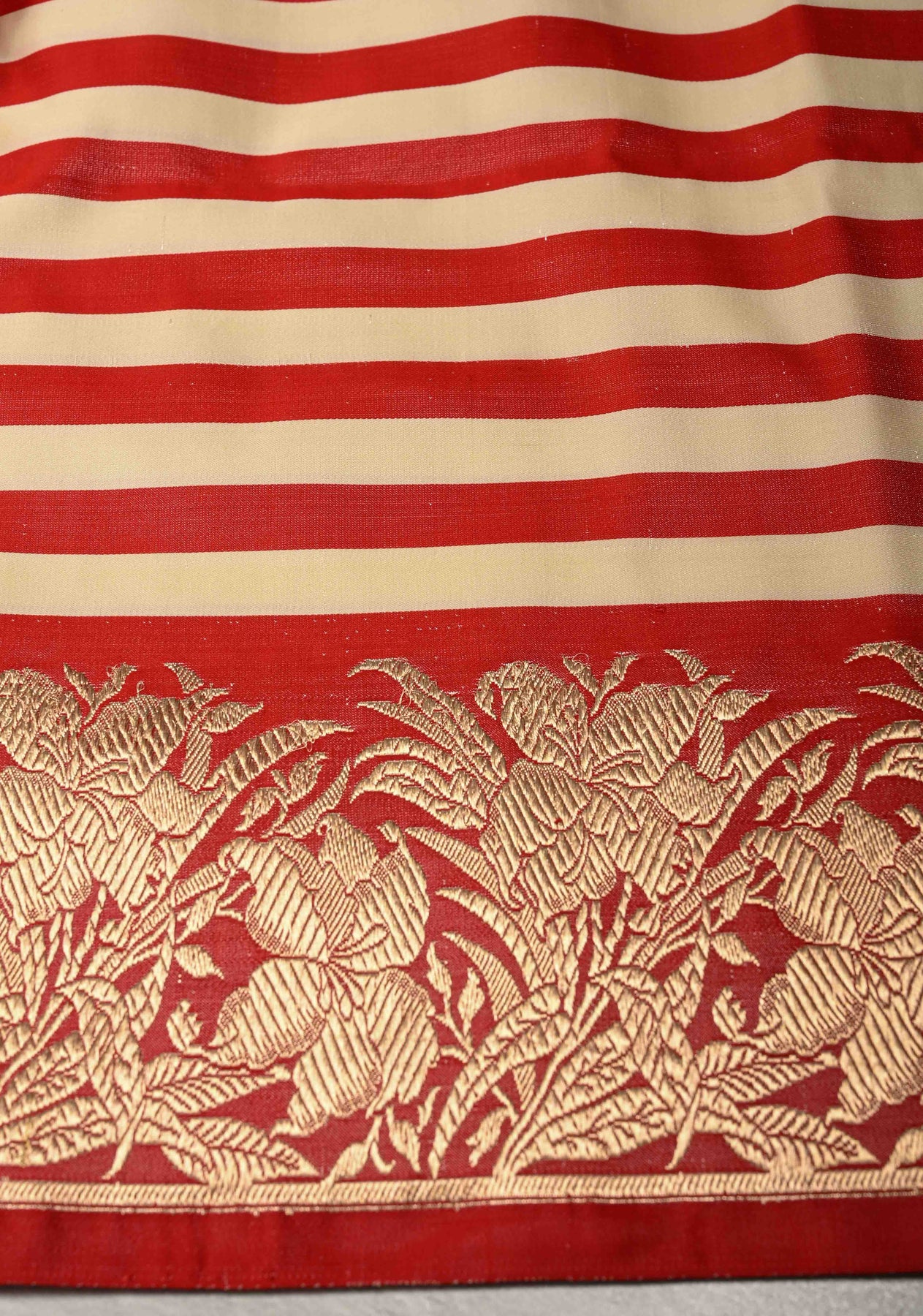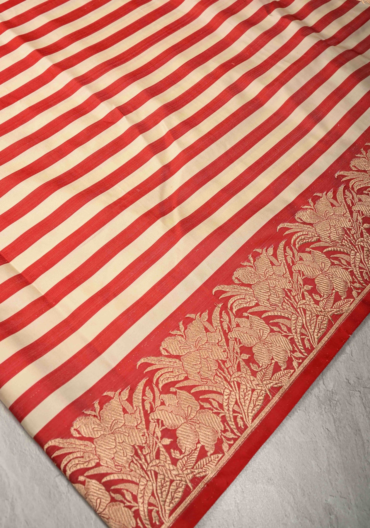 This Red-Cream Banarasi Mashru Silk Saree is a stunning blend of classic elegance and refined craftsmanship. Woven from Mashru silk, it features harmonious red and cream tones accented by delicate horizontal stripes that add a subtle yet sophisticated texture. The saree is beautifully framed with an intricate floral zari border, showcasing traditional artistry and adding a regal touch. Lightweight and comfortable, this saree is perfect for weddings, festivals, and special occasions, embodying timeless beauty with a modern flair.