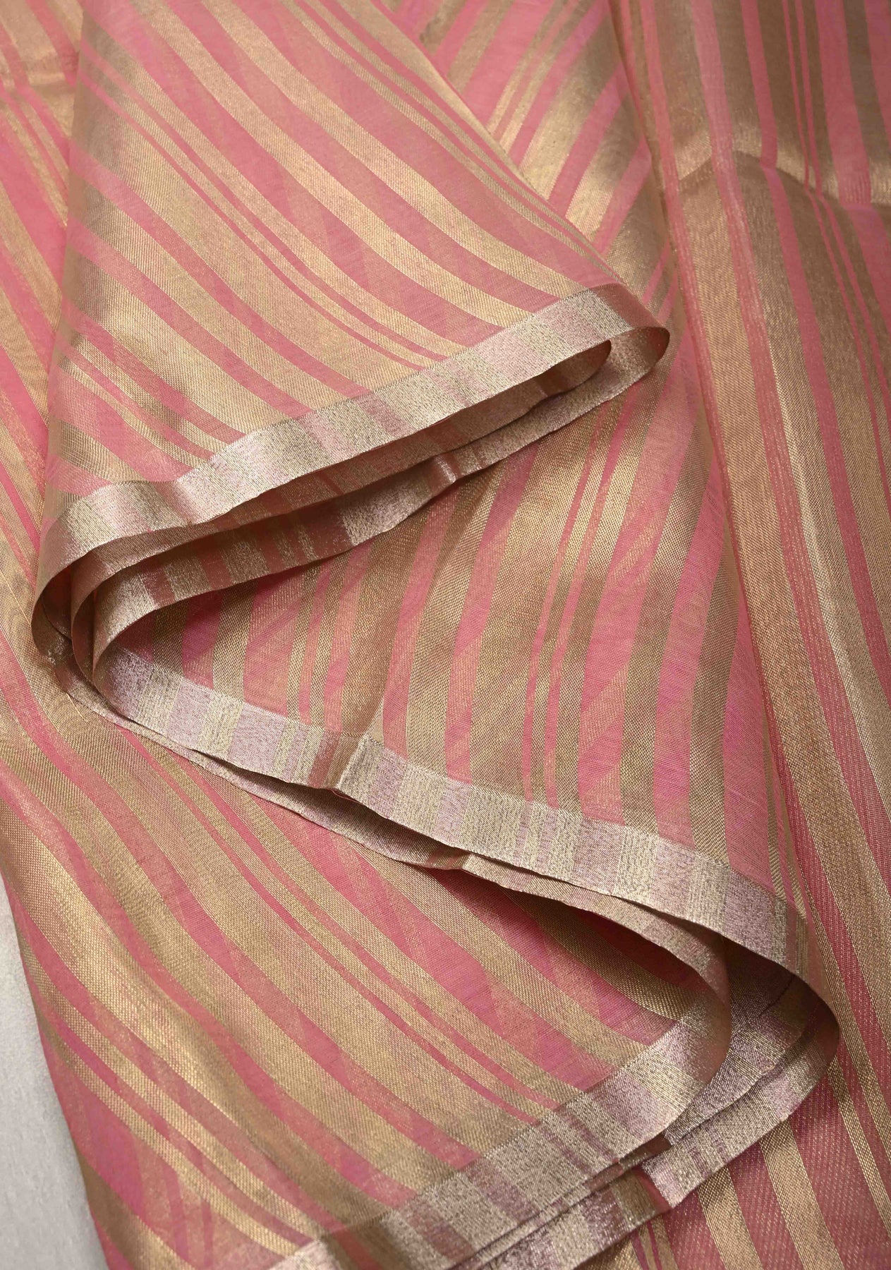 The saree features subtle tissue stripes that add a gentle shimmer and refined texture to the romantic rose pink base. These delicate metallic lines enhance the fabric’s natural glow without overwhelming its softness.