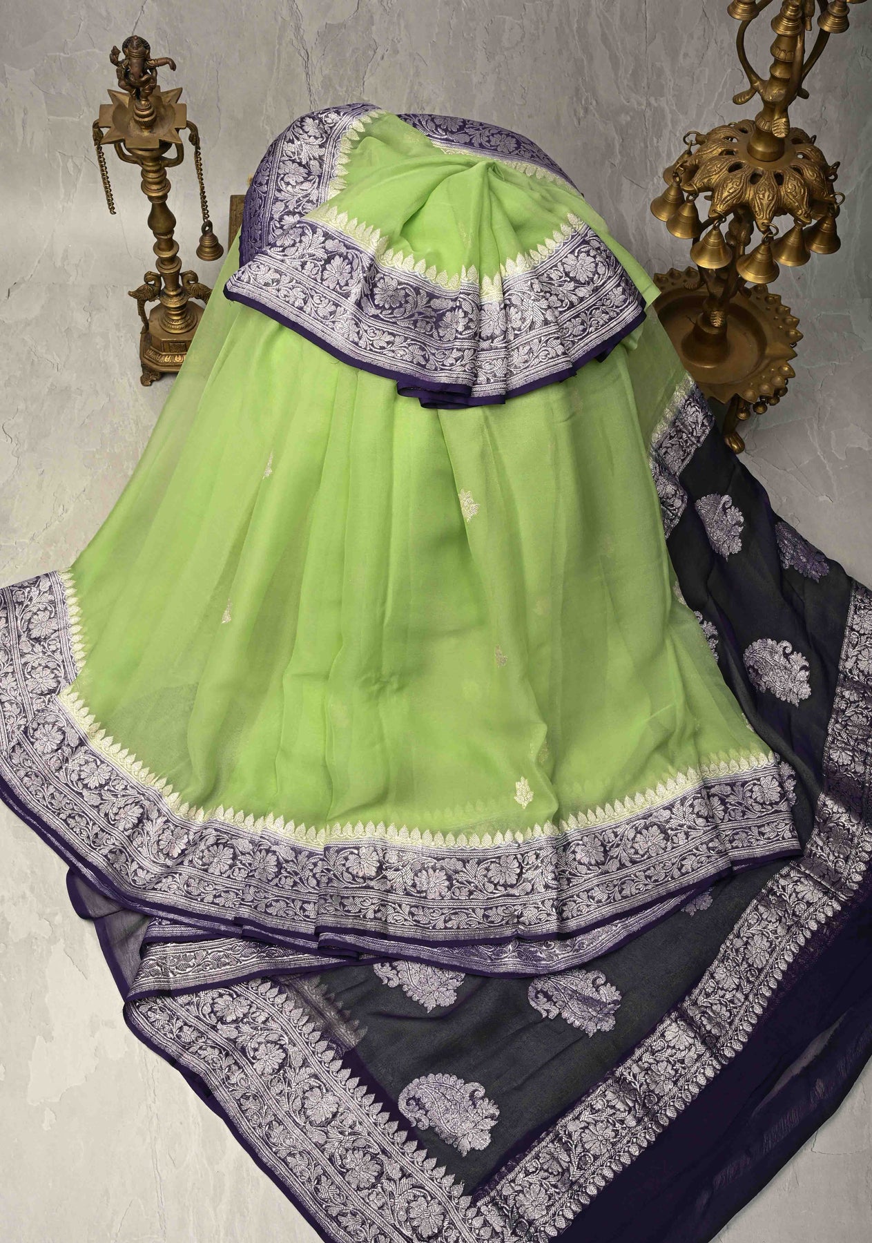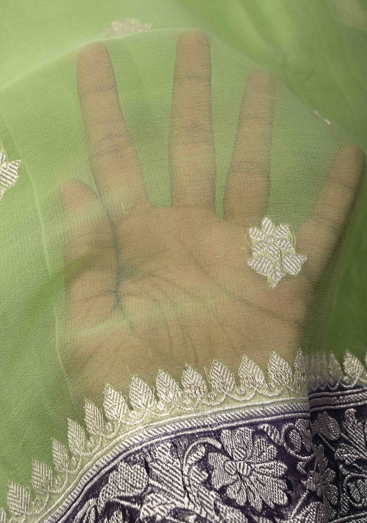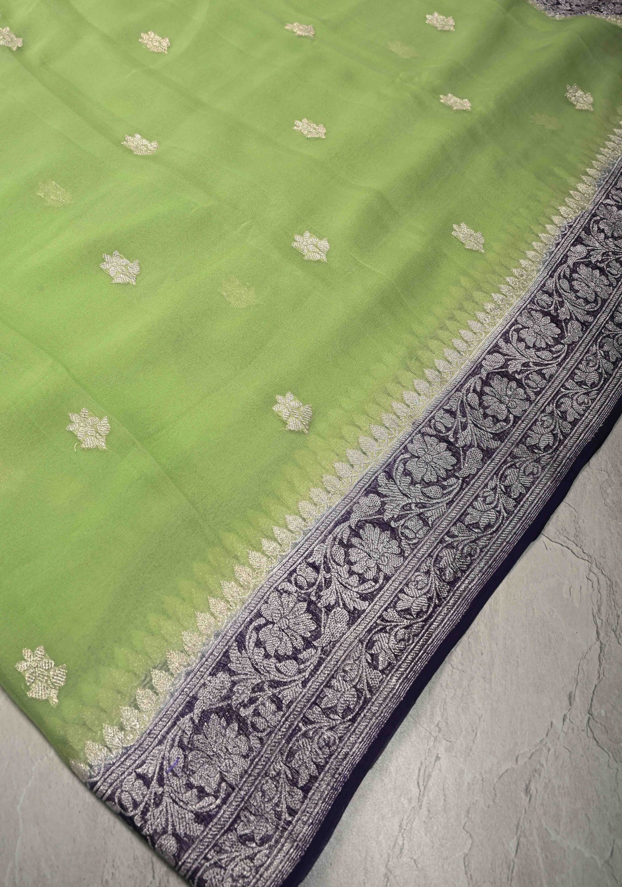 The Sage Green Banarasi Chiffon Silk Saree with Silver Tone Zari Buttas and Contrast Zari Border is a refined blend of grace and traditional artistry. Crafted from lightweight chiffon silk, this saree offers an ethereal drape, perfect for elegant occasions. The soft sage green hue lends a serene and sophisticated charm, beautifully complemented by delicately woven silver tone zari buttas that add a touch of shimmer across the body. The contrast zari border enhances the overall design with intricate detailing, creating a striking visual balance. Ideal for weddings, receptions, or festive celebrations, this saree embodies understated luxury and timeless Banarasi craftsmanship