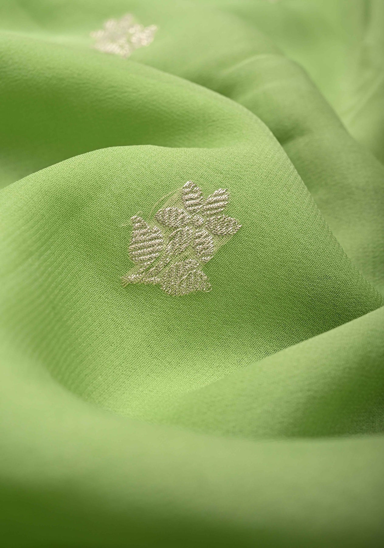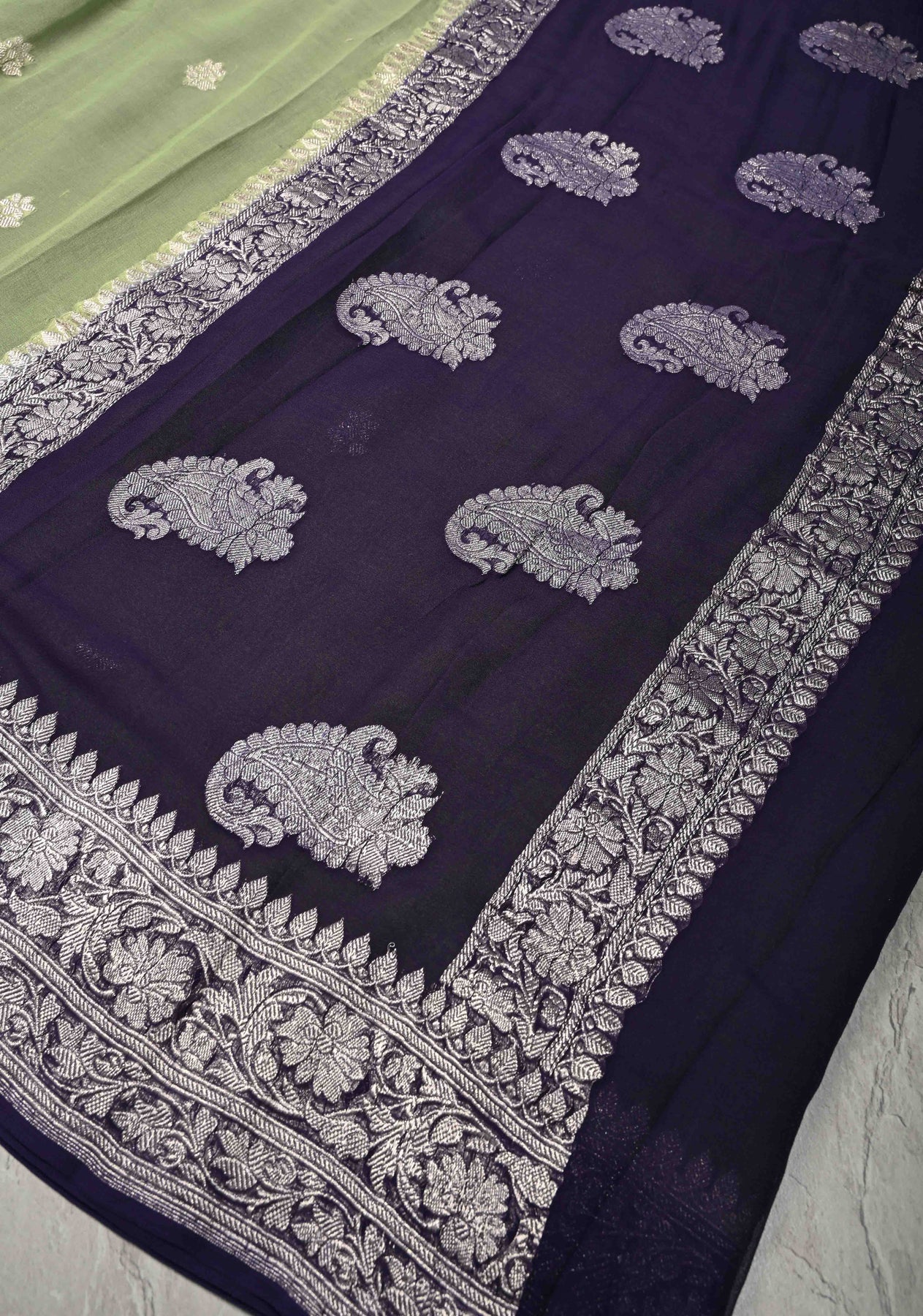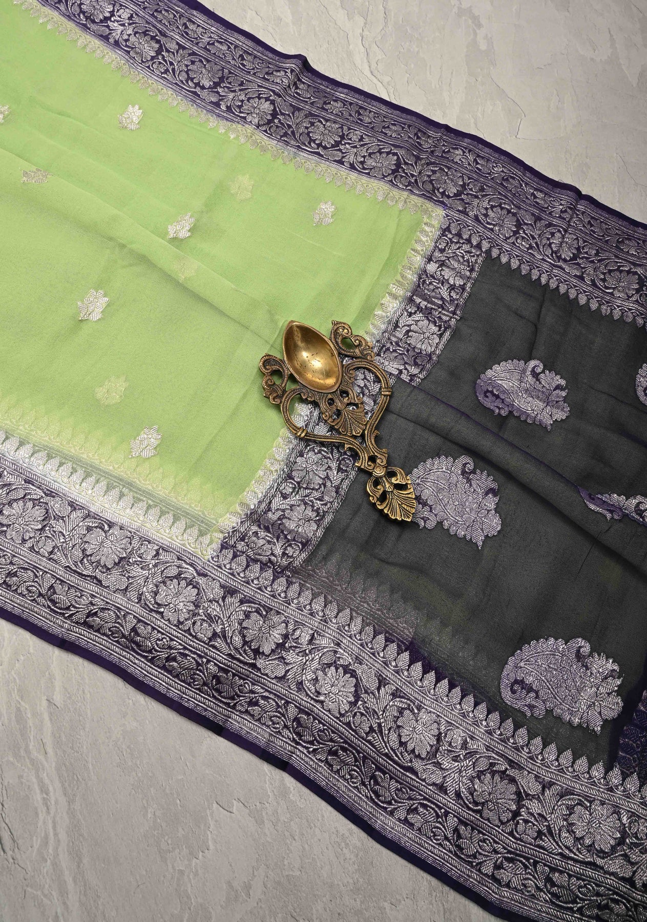 The Sage Green Banarasi Chiffon Silk Saree with Silver Tone Zari Buttas and Contrast Zari Border is a refined blend of grace and traditional artistry. Crafted from lightweight chiffon silk, this saree offers an ethereal drape, perfect for elegant occasions. The soft sage green hue lends a serene and sophisticated charm, beautifully complemented by delicately woven silver tone zari buttas that add a touch of shimmer across the body. The contrast zari border enhances the overall design with intricate detailing, creating a striking visual balance. Ideal for weddings, receptions, or festive celebrations, this saree embodies understated luxury and timeless Banarasi craftsmanship