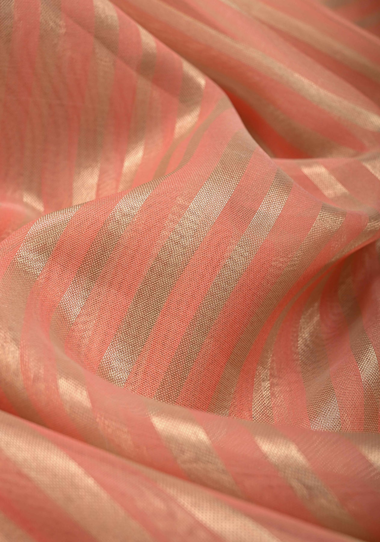 Featuring fine tissue stripes, the saree adds a gentle shimmer and texture to the warm salmon pink base, giving it a graceful glow that catches the light softly. These understated metallic accents enhance the saree’s refined appeal.