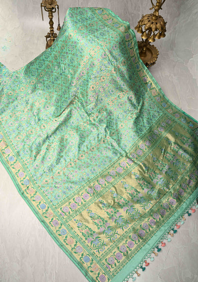 Aqua Green Banarasi Katan Silk Saree with Meenakari Patola Brocade Jaal and Zari Border | SILK MARK CERTIFIED