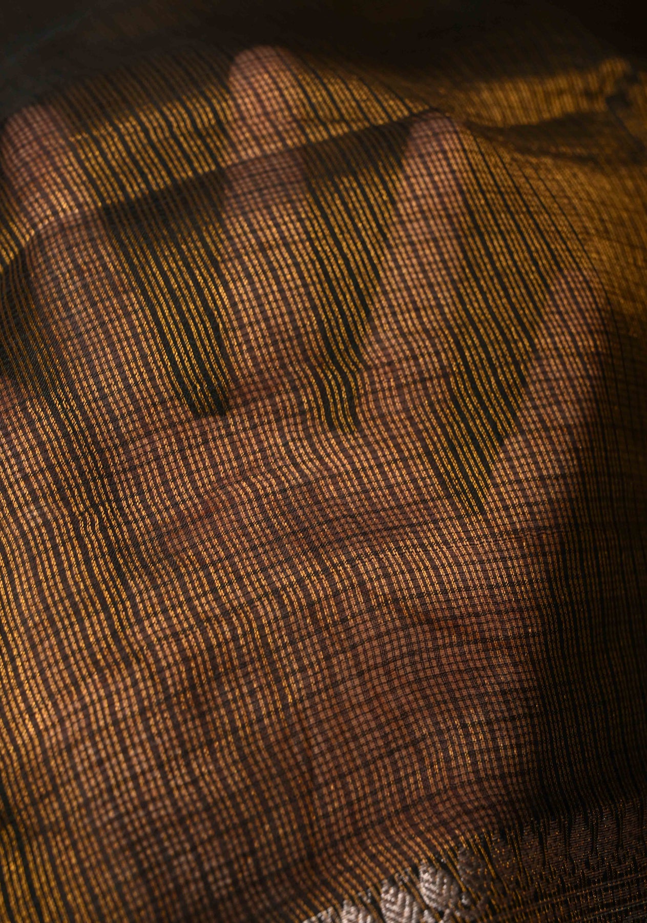The Black-Gold Banarasi Kota Doria Tissue Cotton Saree is a refined blend of lightweight comfort and traditional Banarasi elegance. Crafted from airy Kota Doria cotton with a subtle tissue finish, it features a black base that beautifully complements the delicate golden shimmer. The saree is adorned with a striking Sona Rupa zari border, woven in gold and silver tones, adding a touch of grandeur to its understated grace. The fine checkered weave typical of Kota Doria enhances its texture, making it breathable yet luxurious. Perfect for festive gatherings, formal occasions, or elegant daywear.