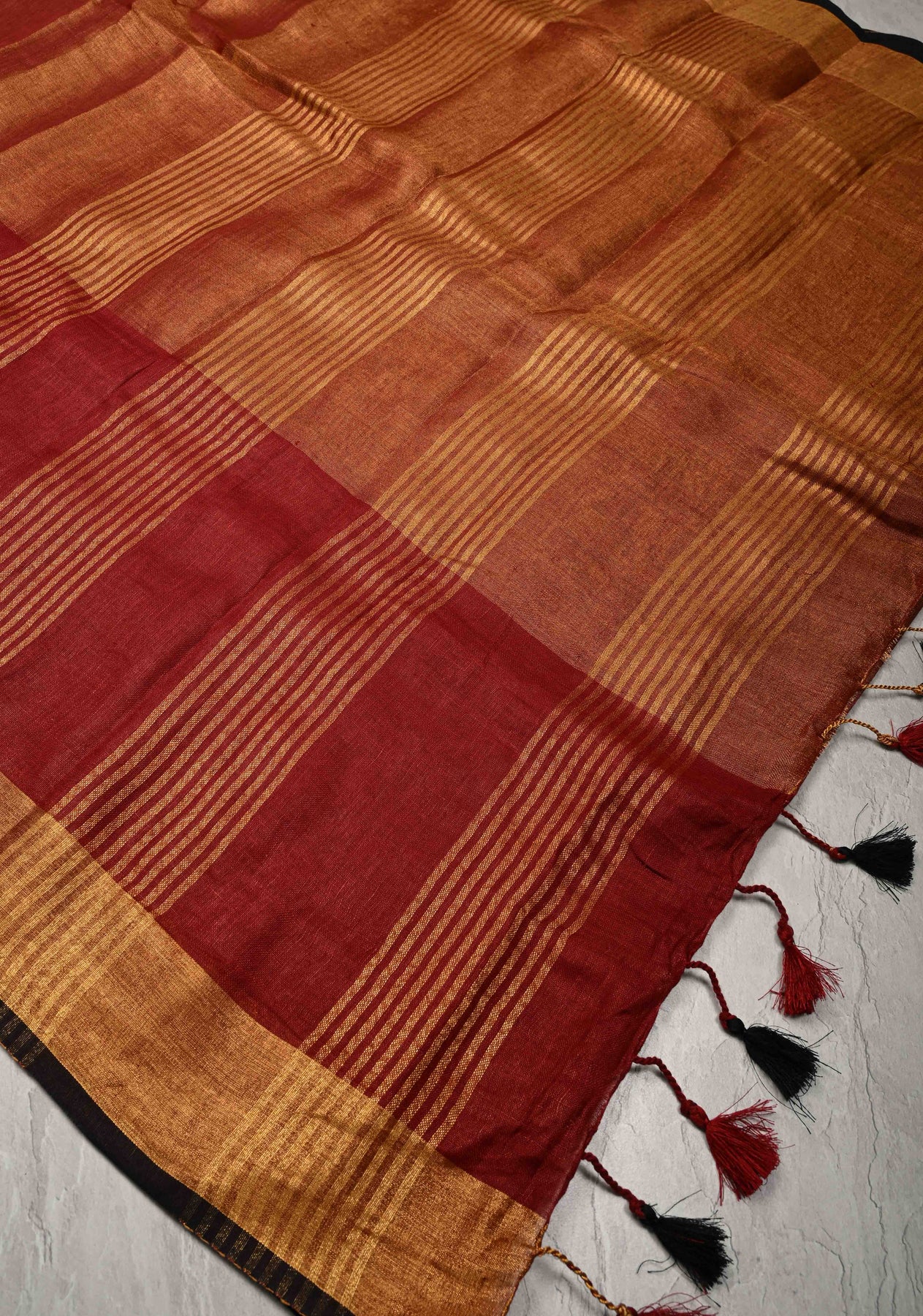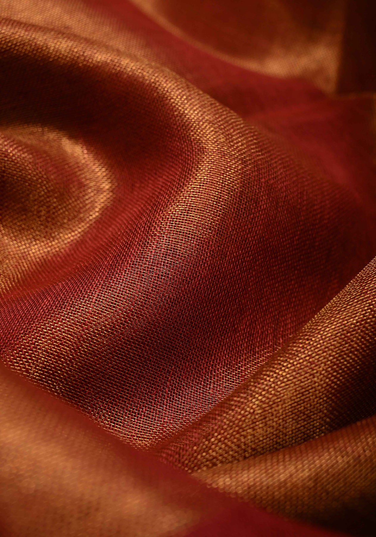 Exude timeless elegance with this Maroon Tissue Body Linen Saree that beautifully combines rich hues and intricate craftsmanship. The muted antique gold tissue base adds a subtle shimmer to the deep maroon fabric, enhanced by delicate Sona Rupa polka dots woven throughout, creating a refined texture. The unique skirt-style zari border offers a graceful finish, blending traditional artistry with contemporary design. Lightweight and breathable, this saree is perfect for festive occasions, weddings, and special celebrations where classic sophistication is desired.