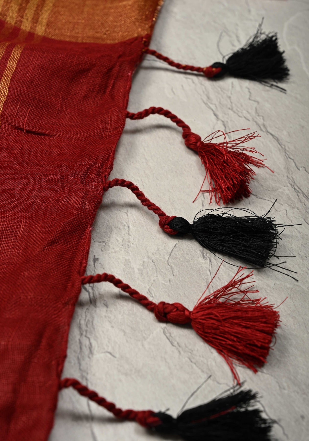 The saree is ready with fall and pico done. Long hand-knotted tassels line the pallu.