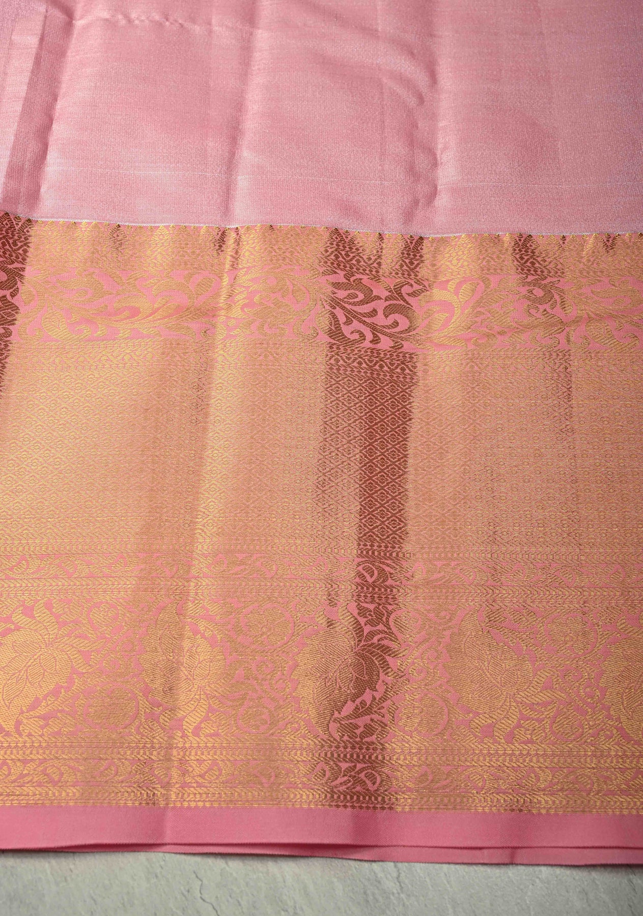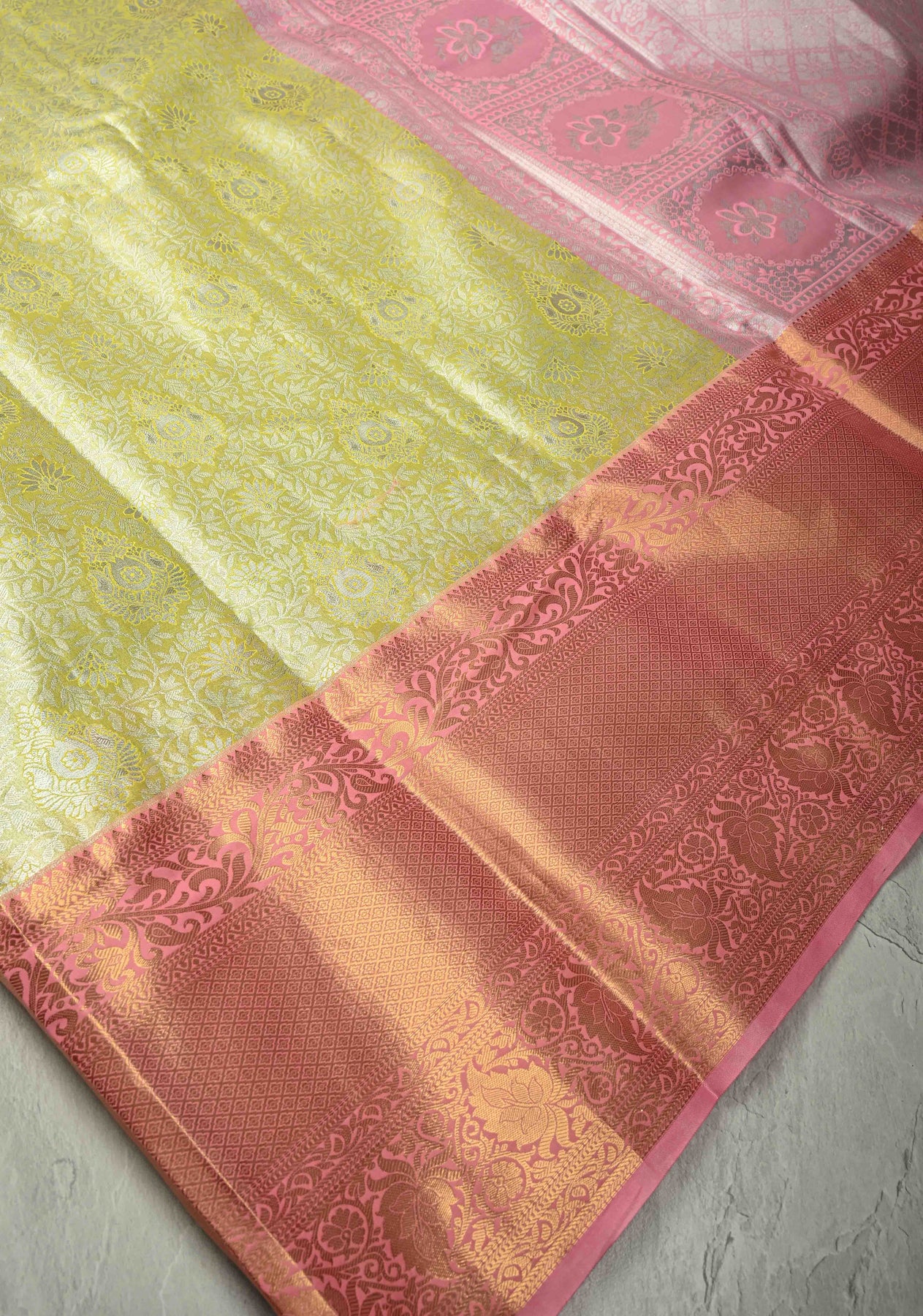 This Pastel Lime Green Kanjivaram Tissue Semi-Silk Saree radiates subtle charm and contemporary elegance. The soft, refreshing pastel lime green hue, enhanced by the lustrous tissue weave, gives the saree a delicate shimmer that catches the light gracefully. Intricately adorned with a Meenakari floral brocade jaal, the saree showcases fine craftsmanship and intricate floral motifs that add artistic richness to the drape. The contrast wide zari border in golden tones provides a regal finish, balancing opulence with understated beauty. Ideal for weddings, festive celebrations, or special occasions, this saree embodies timeless sophistication and is a perfect choice for those seeking elegance with a modern touch