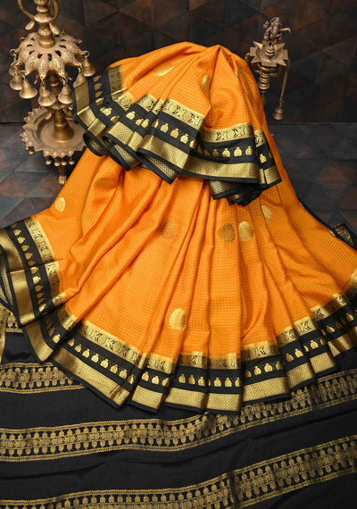 Metallic Orange Zari Checks on Pure Mysore Silk saree Floral Zari Motifs And Zari Border in KSIC Grade Thickness | SILK MARK CERTIFIED