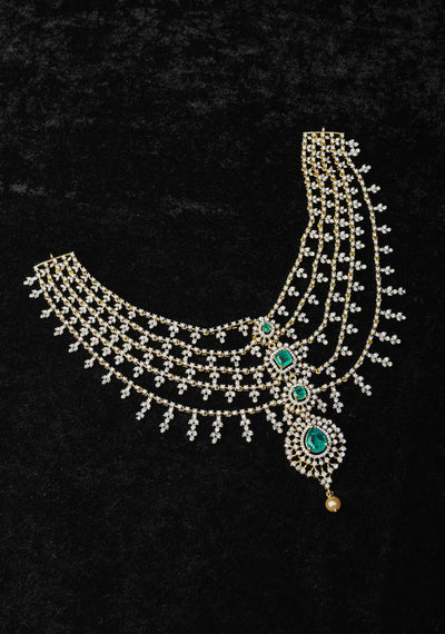 92.5 Silver 5 Layer White CZ Necklace with tiered Green Emerald Look Stone Pendant