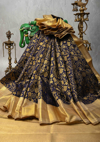 Midnight Blue Soft Silk Saree with Resham Weave Butta and Border | SILK MARK CERTIFIED