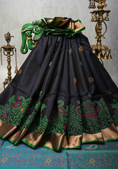 Celebrity design Half and Half Vanasingaram stripes Kanjivaram Black Silk Saree | SILK MARK CERTIFIED