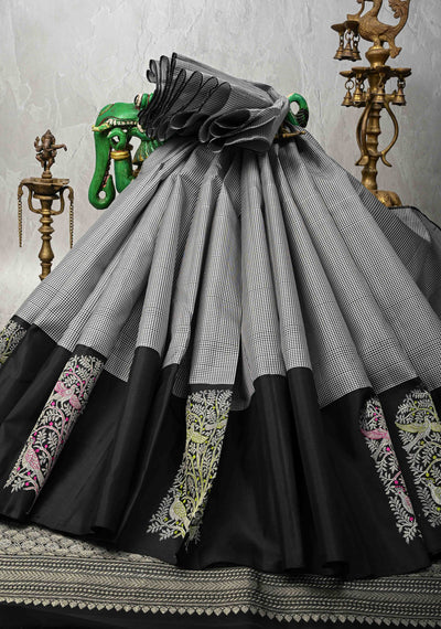 Black and White Checks Kanjivaram Pure silk saree with Meenakari Tree of Life Motifs Border | SILK MARK CERTIFIED