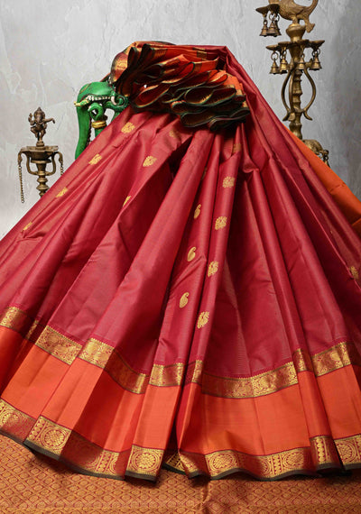 Brick Maroon Kanjivaram Pure Silk Saree with Deer Buttas, Parrot Palluand Minimal Zari Border | SILK MARK CERTIFIED