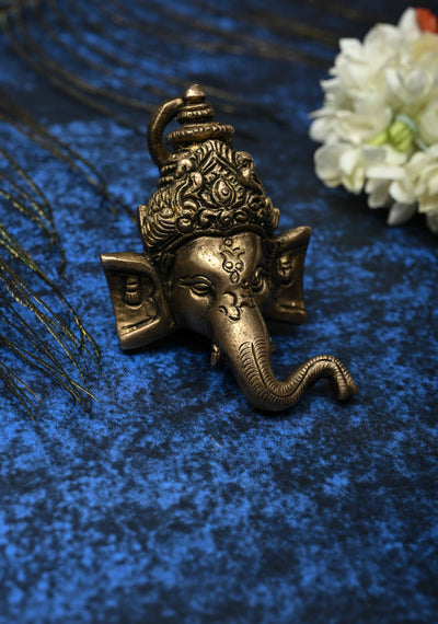 2.75" Small Antique Golden Brass Ganesha Idol (Face), Indian Decorative Wall Hanging