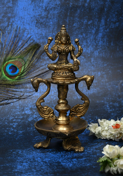 7.5" Antique Brass Lakshmi with Swans Diya, Indian Decorative Table Top and Pooja Article