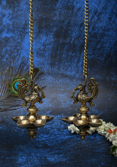 Antique Brass Peacock Hanging Diya (Set of 2), Indian Decorative Lamps with Chain and Hooks