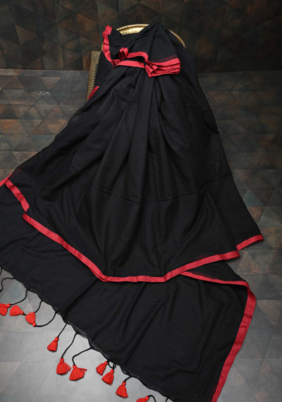 Dark Pink Mulmul Cotton Saree with Long tassels