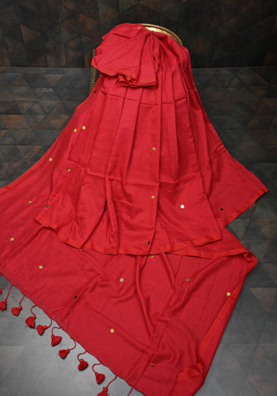 Red Mulmul Cotton Saree with Large coin Sequin and long Tassels