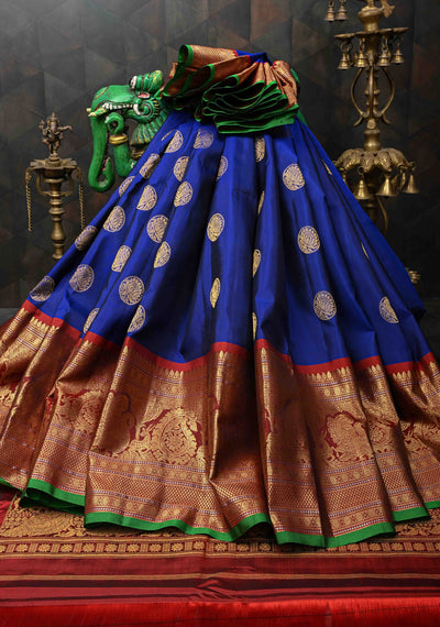 Blue Gadwal Silk Saree with Lotus Buttas and Wide Zari Contrast Border | SILK MARK CERTIFIED