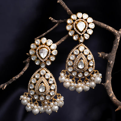 Pure 92.5 Silver, Gold Plated Kundan Earrings with Pearl Drops and CZ Details