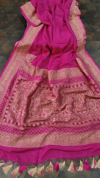Fuchsia Pure Mysore Crepe Silk Saree with Koniya Motifs and Brocade Blouse Piece | SILK MARK CERTIFIED
