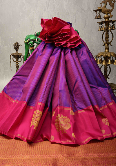 Vairaoosi Purple Dual tone Pure Kanjivaram Silk Handloom Saree Zari Stripes and Distinct Peacock Motofs on Border | SILK MARK CERTIFIED