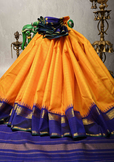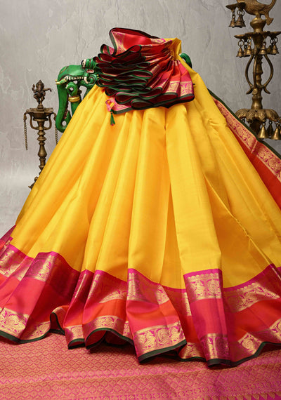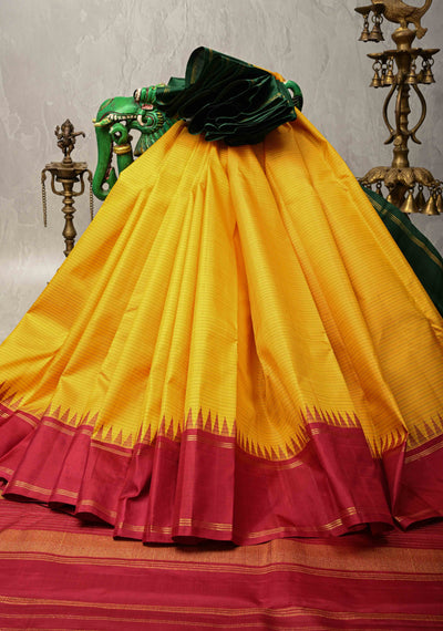 Yellow Dual Tone Pure Kanjivaram Silk Saree with Contrast Temple Border | SILK MARK CERTIFIED