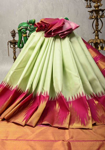 Light Tea Green Korvai Kanjivaram Pure Silk Saree with Contrast Temple Zari Border | SILK MARK CERTIFIED