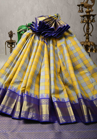 Mustard Yellow Kanjivaram Pure Silk Saree with Checks Pattern and Contrast Temple Zari Border | SILK MARK CERTIFIED