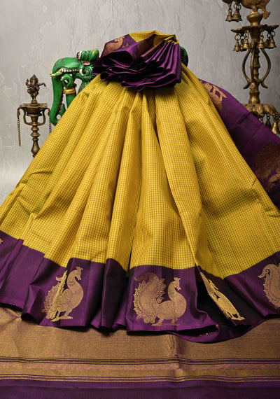 Yellow Korvai Weave Kanjivaram Pure Silk Saree with Checks Pattern and Distinct Annapakshi Motifs on Contrast Border | SILK MARK CERTIFIED