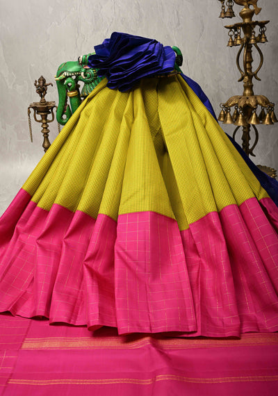 Mubbagam 3 Part Kanjivaram Pure Silk Saree in Hot Pink-Chartreuse and Royal Blue with Gingham-Zari Checks | SILK MARK CERTIFIED