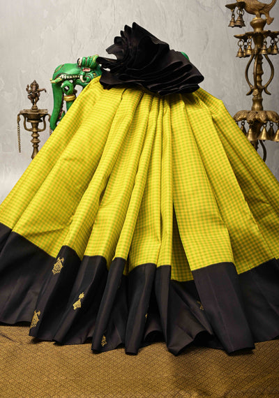 Yellow checks Kanjivaram Pure Silk Saree with Contrast Black Skirt Border | SILK MARK CERTIFIED