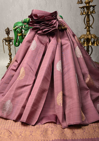 Dusty Amethyst Borderless Pure Kanjivaram Silk Saree with Gold-Silver Life of Tree Motifs | SILK MARK CERTIFIED