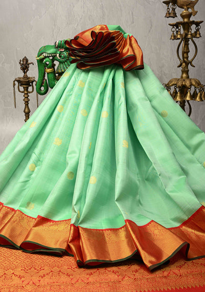 Meduim Spring Green Kanjivaram Pure Silk Saree with Floral Zari Buttas and Korvai Contrast Zari Border | SILK MARK CERTIFIED