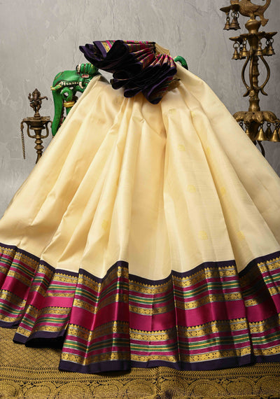 Off White Korvai Kanjivaram Pure Silk Saree with Zari Buttas and Contrast Zari Border | SILK MARK CERTIFIED