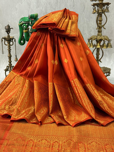 Rust Orange Gadwal Silk Saree with Zari Buttas and Arch Wide Zari Border | SILK MARK CERTIFIED