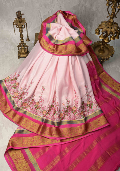Victorian Garden - Baby Pink Mysore Silk Saree with Floral Vine Embroidery KSIC Grade Thickness | Silk Mark Certified