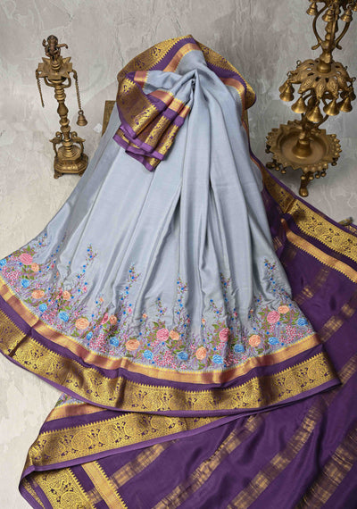 Victorian Garden - Bluish Gray Mysore Silk Saree with Floral Vine embroidery KSIC Grade Thickness | SILK MARK CERTIFIED