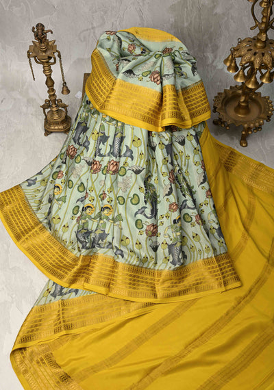 Sage Green Mysore Silk Saree with Kalamakari Digital Print and Contrast Zari Borders KSIC Grade Thickness | Silk Mark Certified