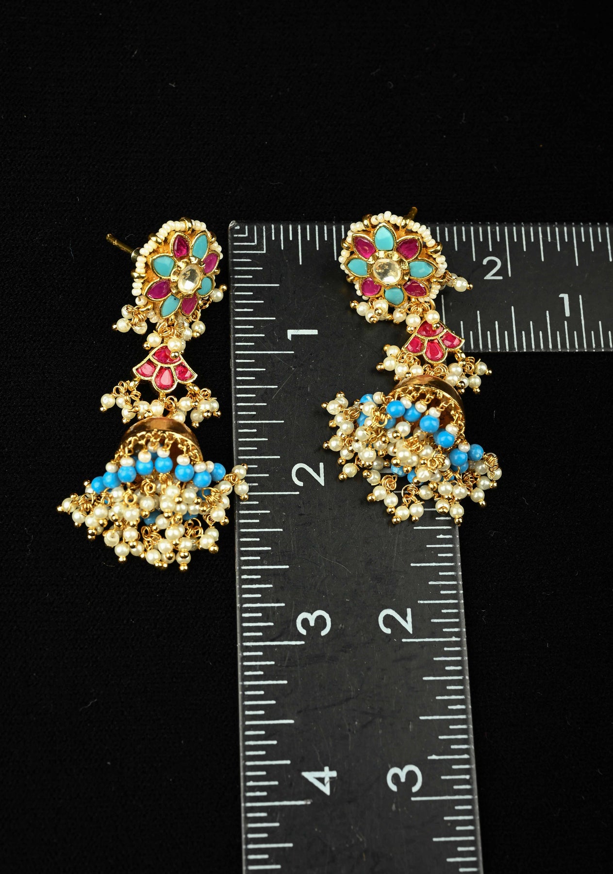Add a vibrant touch of tradition to your ensemble with these stunning Magenta and Teal Kundan and Beaded Jhumka Earrings. The rich magenta and teal tones create a beautiful contrast, while the intricate Kundan detailing brings timeless regal charm to the design.